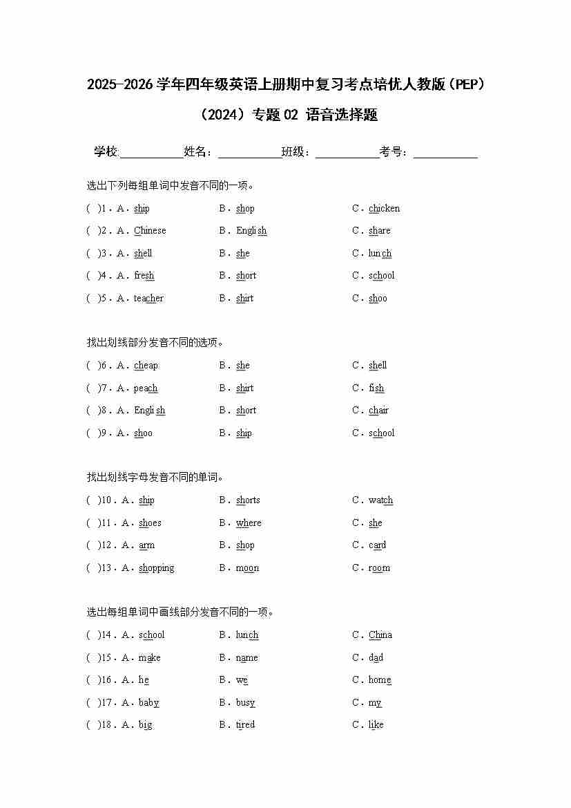 专题02 语音选择题-2025-2026学年四年级英语上册期中复习考点培优人教版(PEP)(2024)(含答案解析)