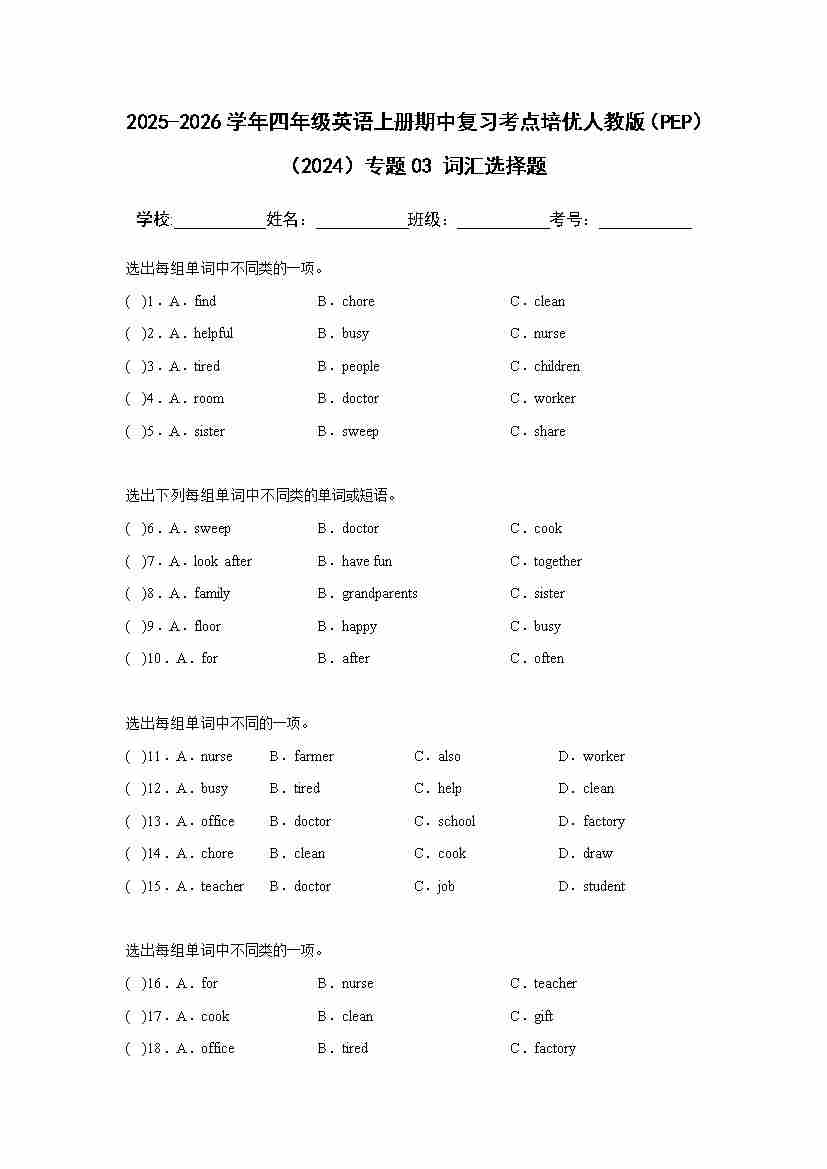 专题03 词汇选择题-2025-2026学年四年级英语上册期中复习考点培优人教版(PEP)(2024)(含答案解析)