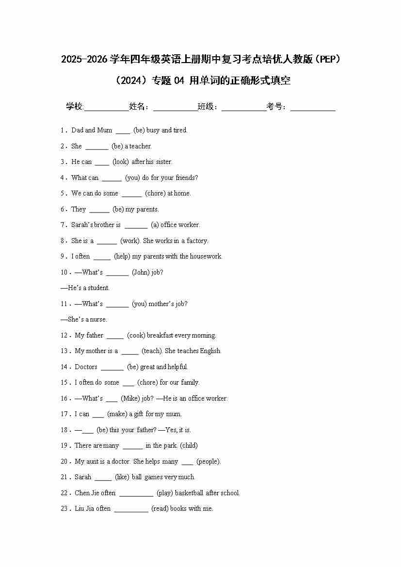 专题04 用单词的正确形式填空-2025-2026学年四年级英语上册期中复习考点培优人教版(PEP)(2024)(含答案解析)