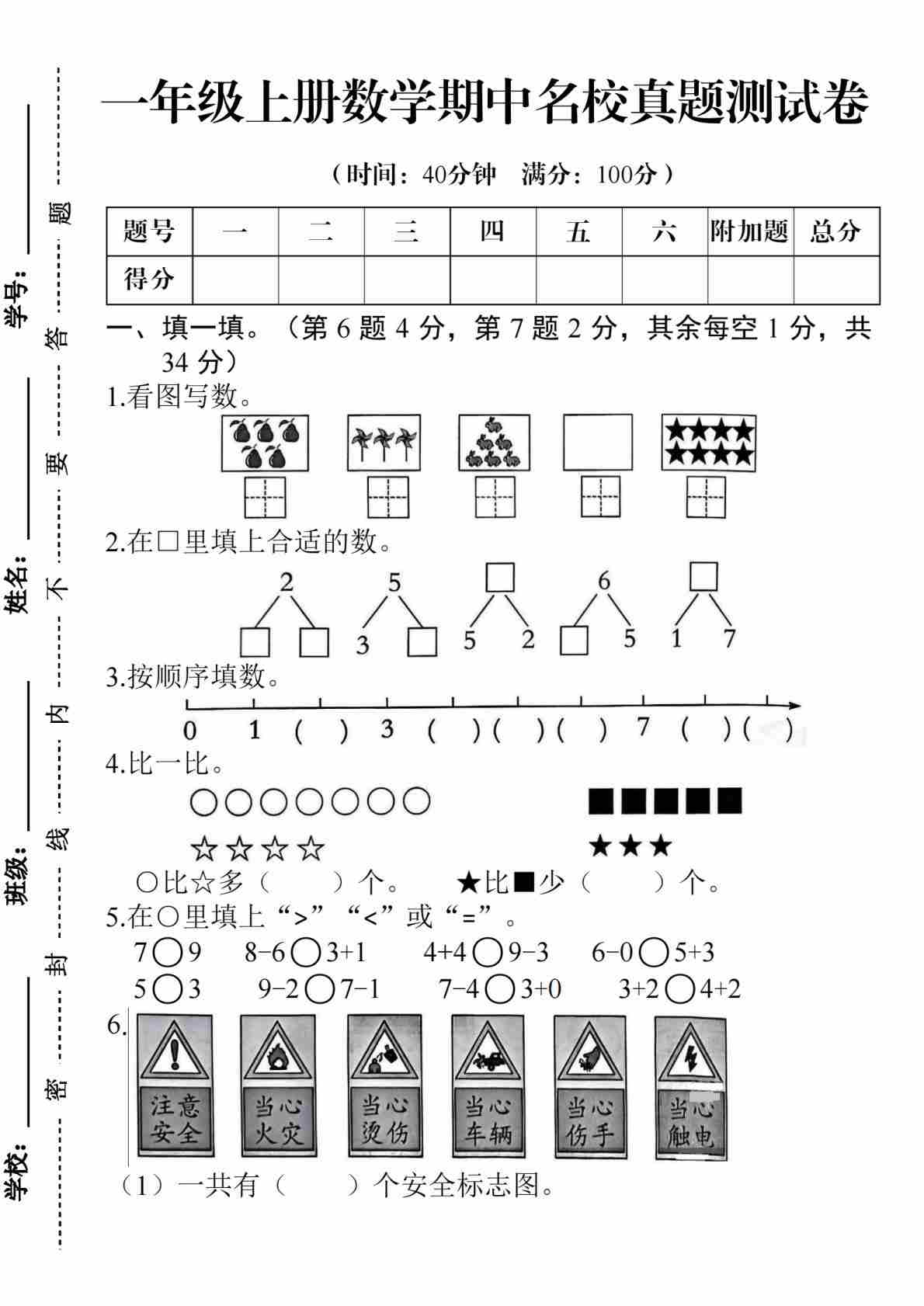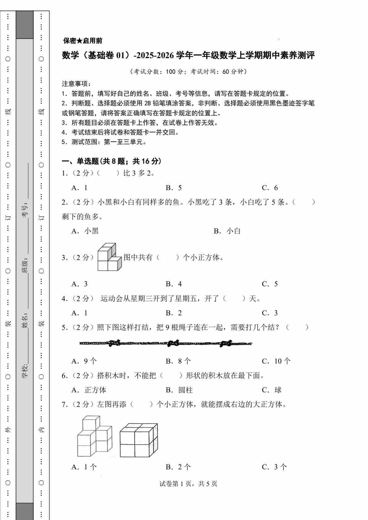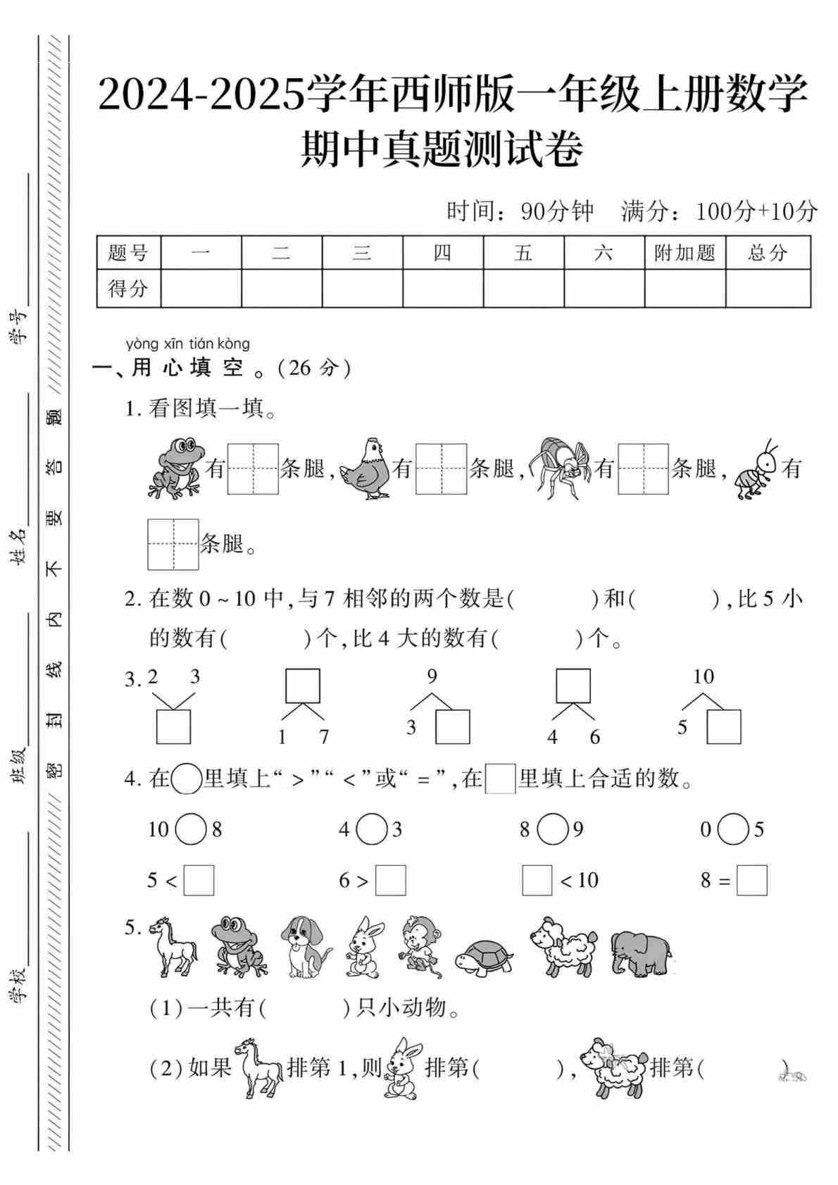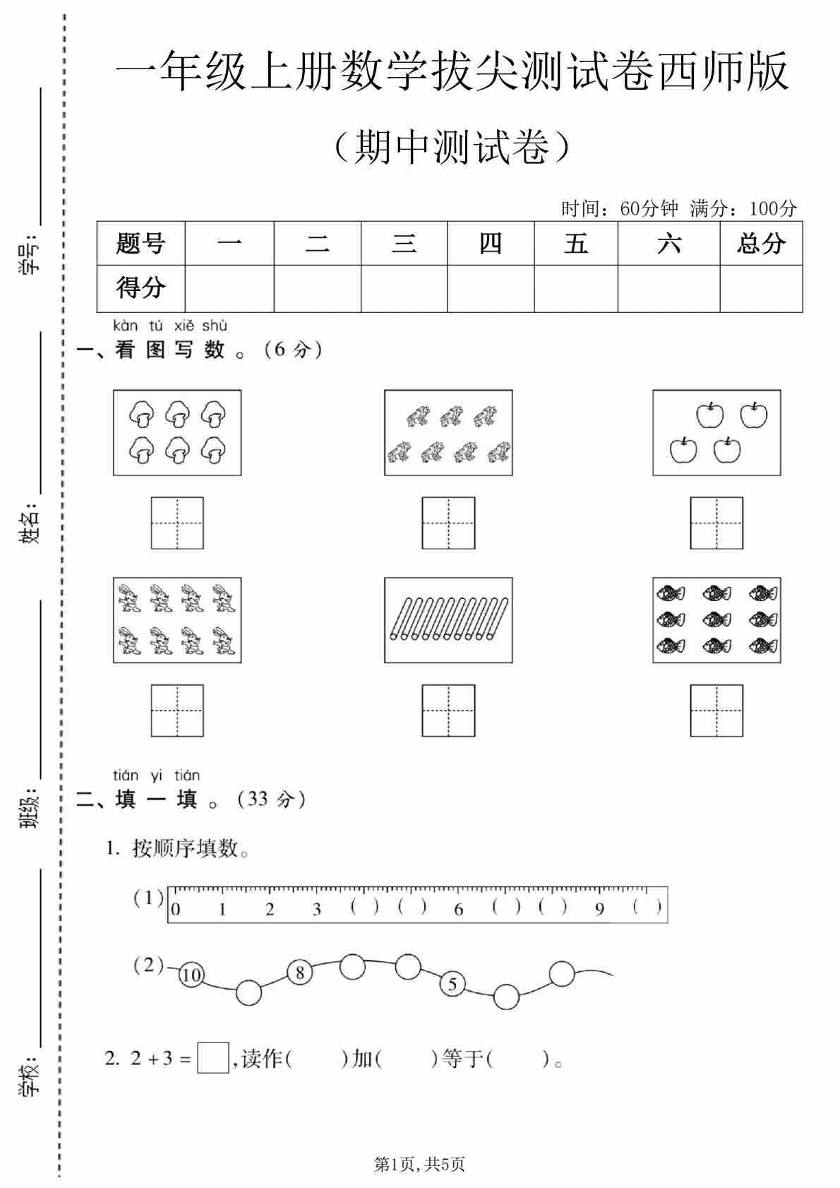 一上西师版数学【期中测试卷5】