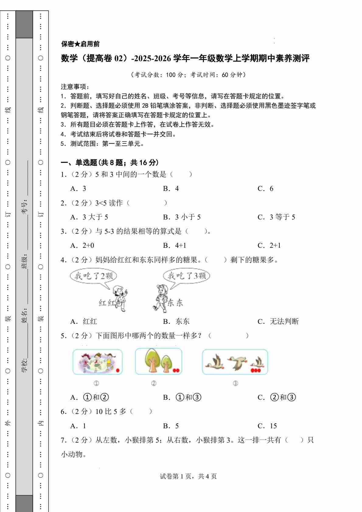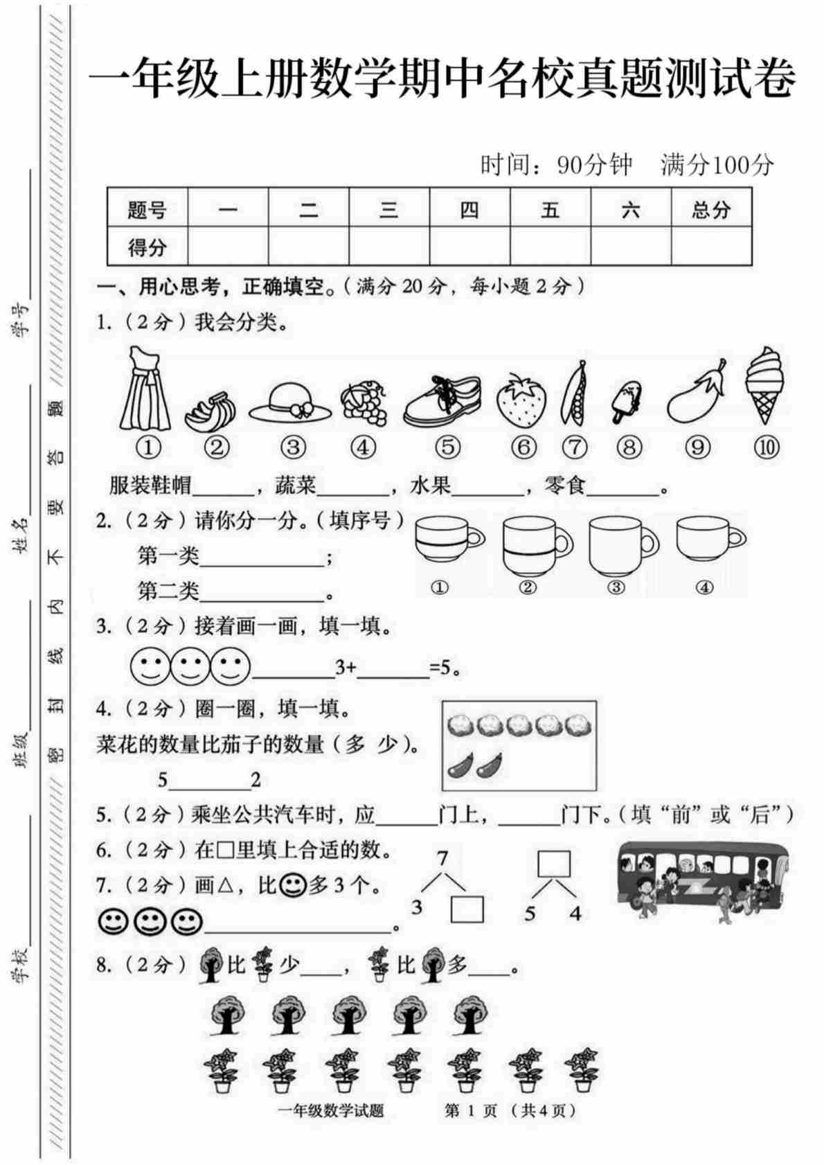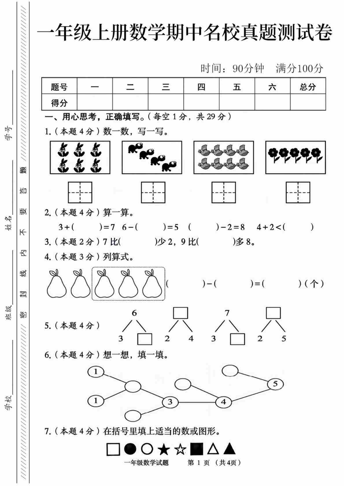 一上西师版数学【期中测试卷4】