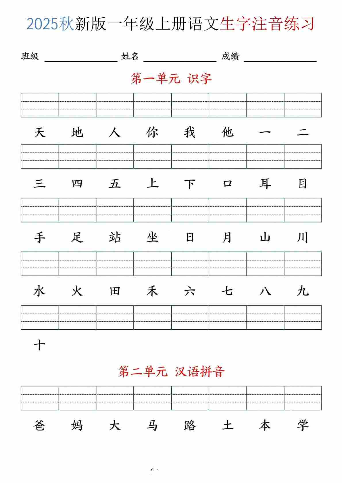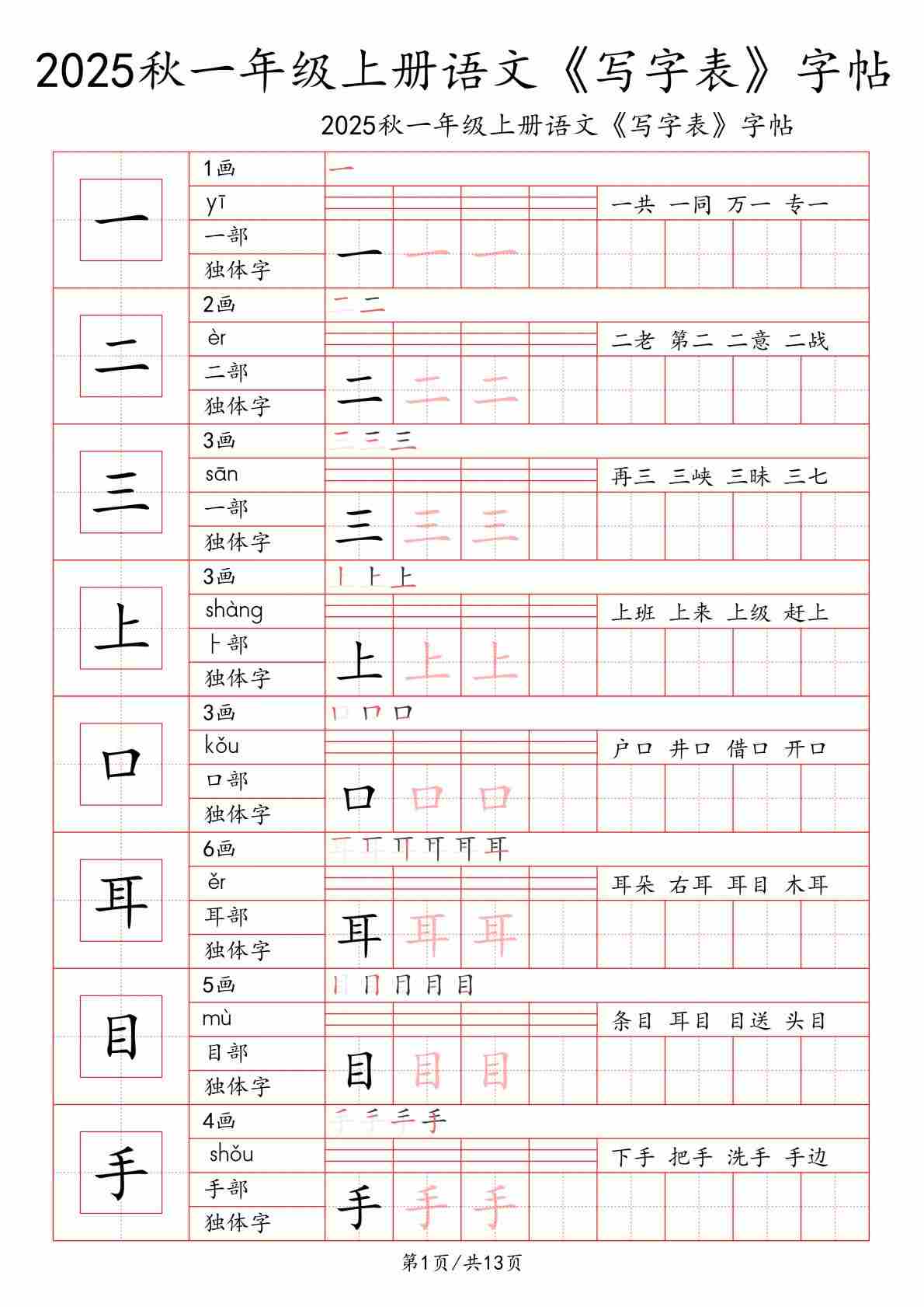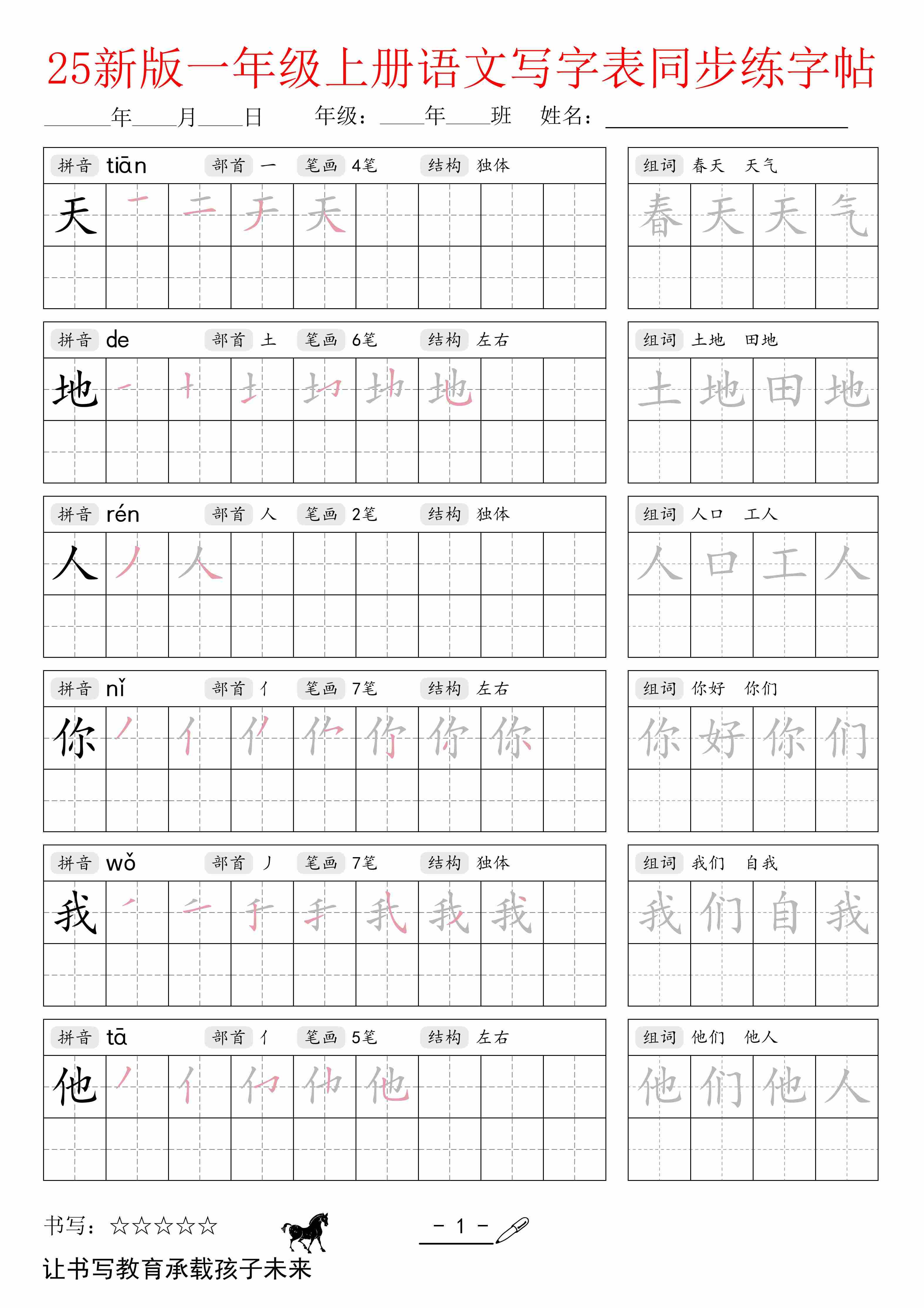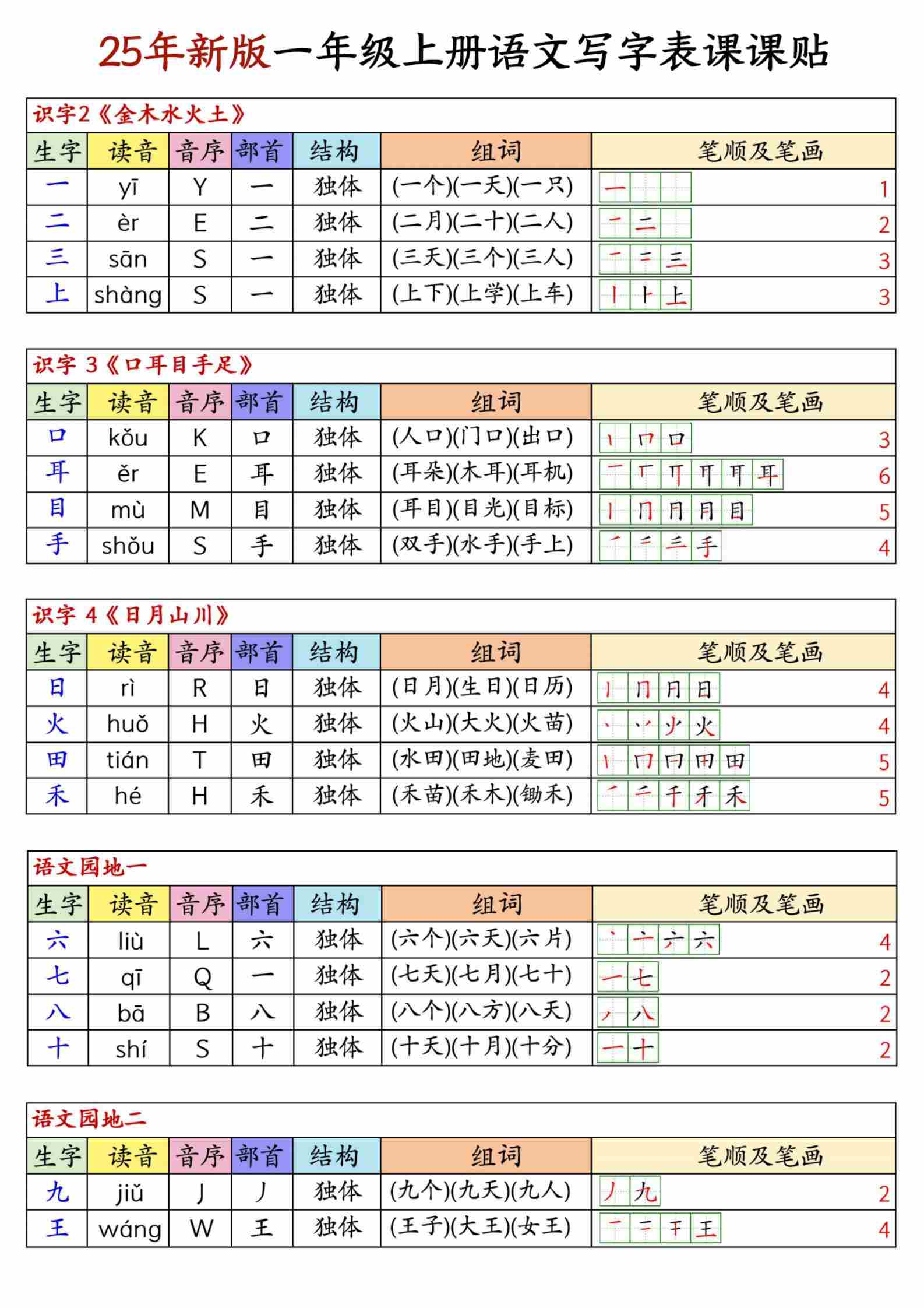 一上语文25年新版写字表生字组词笔顺课课贴6页