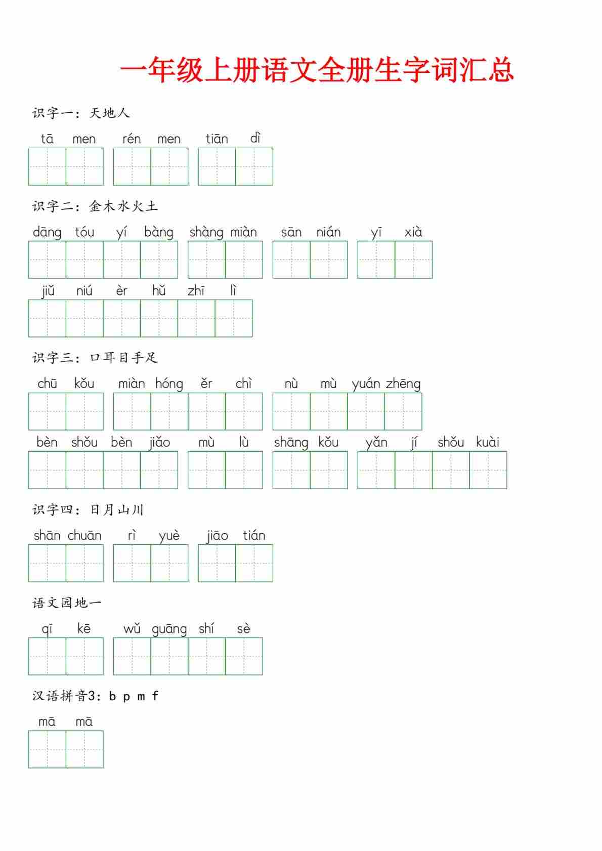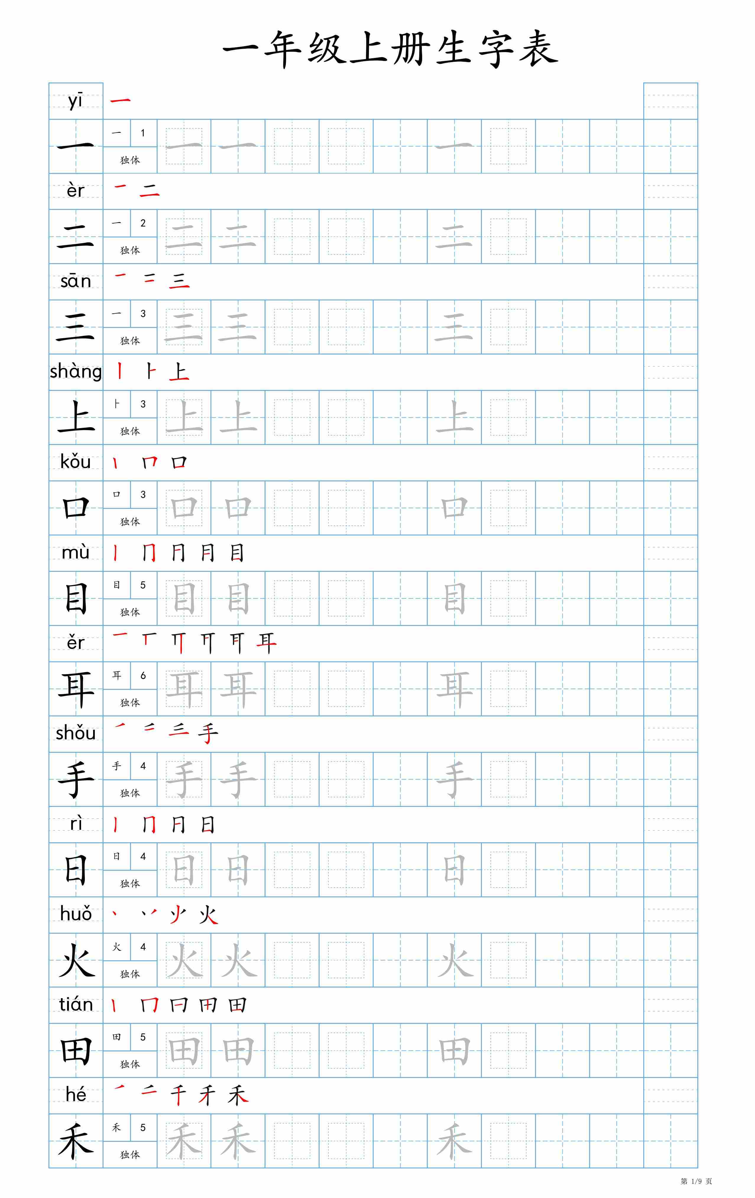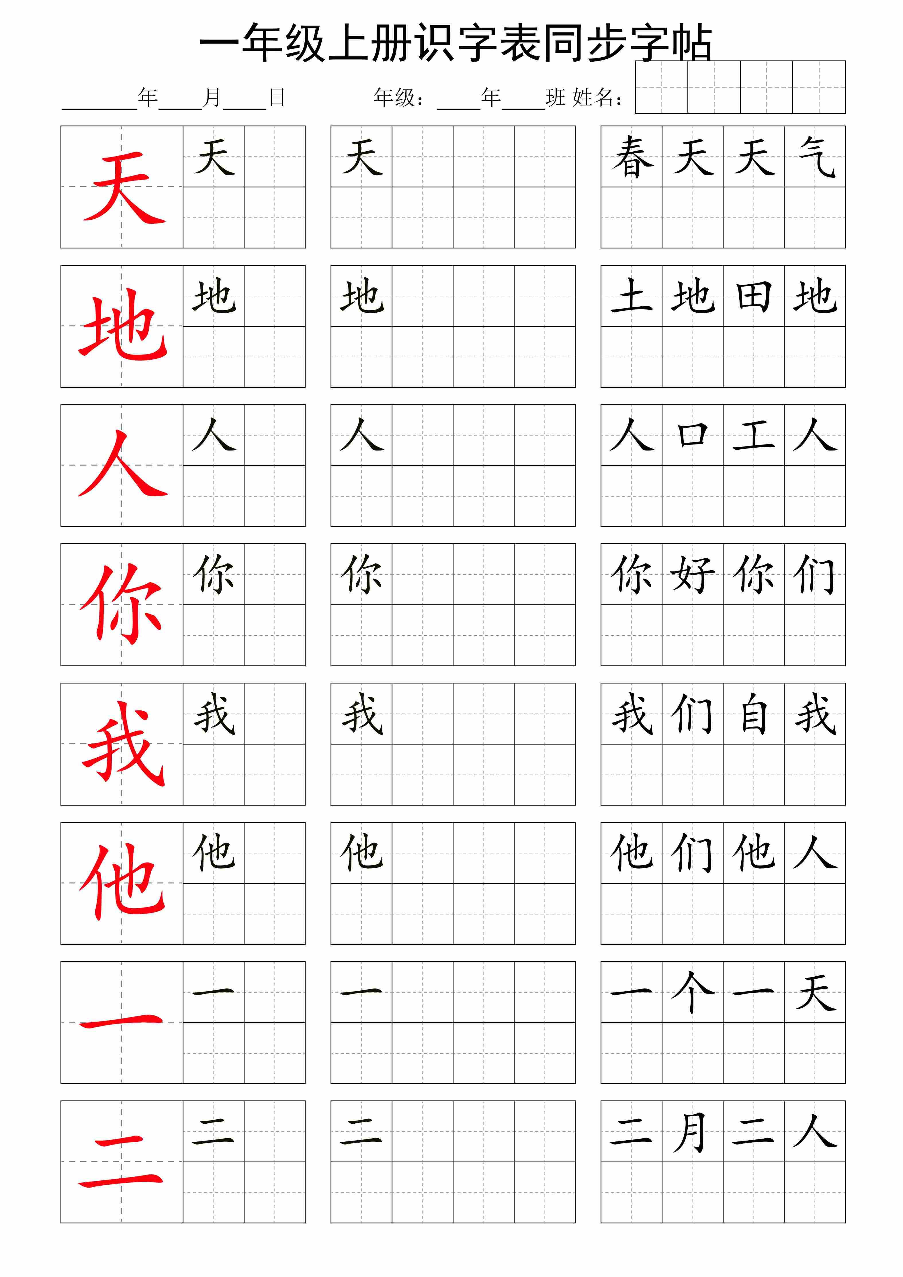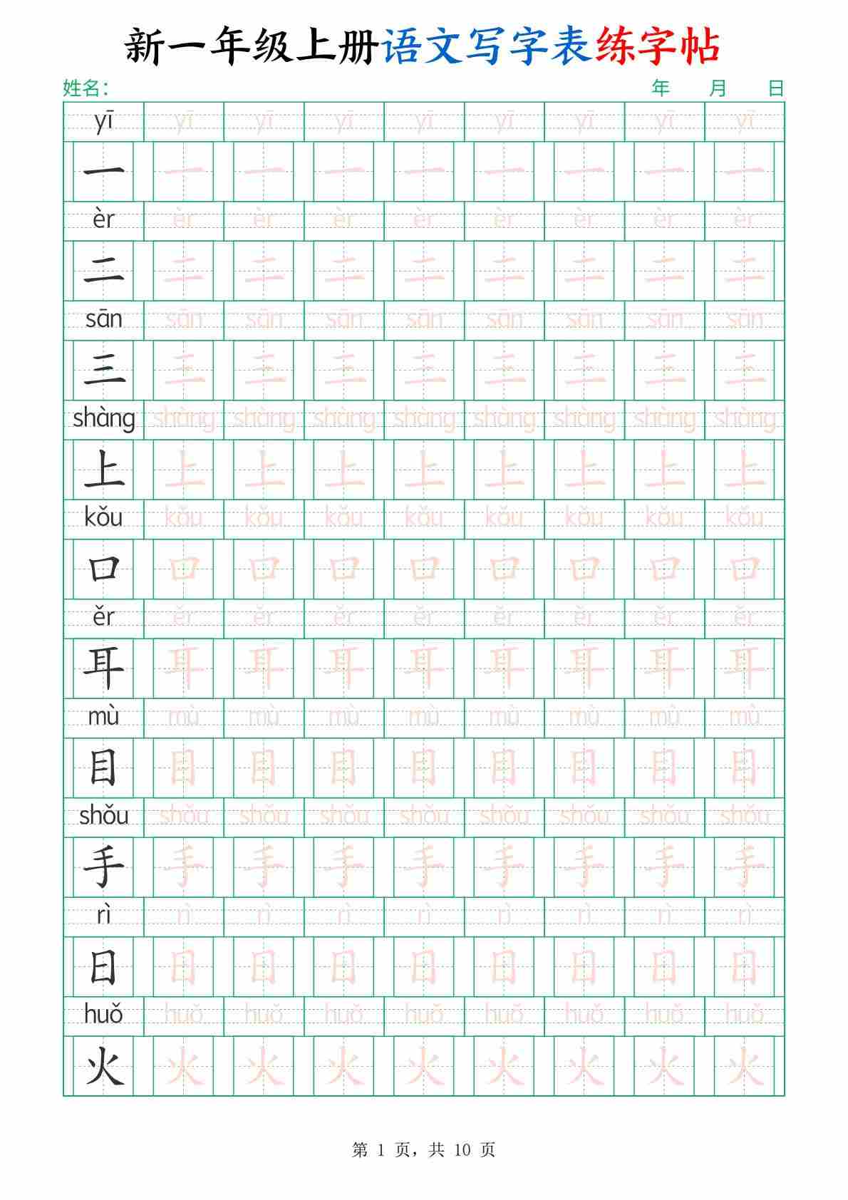 一上语文写字表练字帖(生字拼音描红100字)10页 (1)