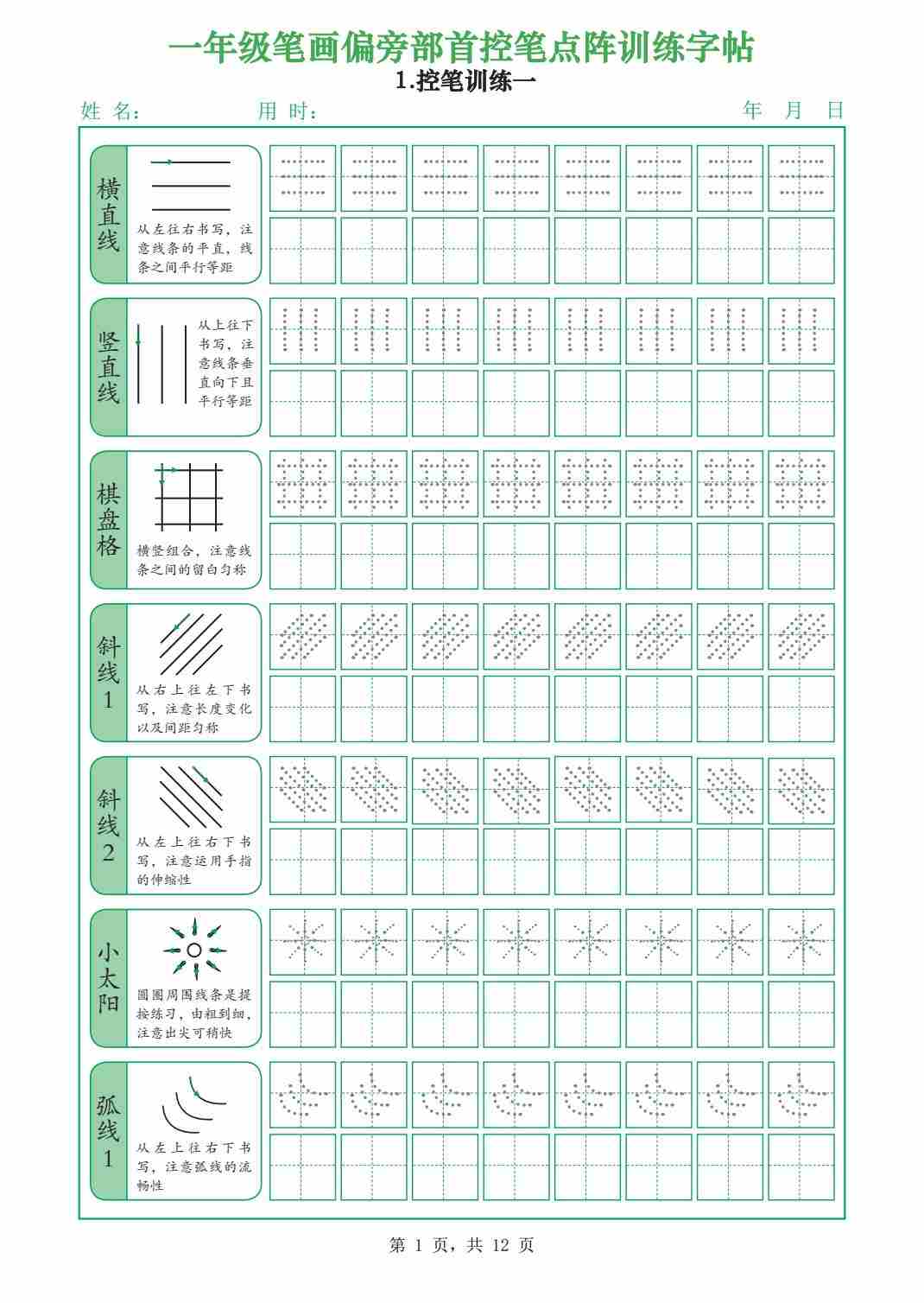 一年级笔画偏旁部首控笔点阵训练字帖(12页)