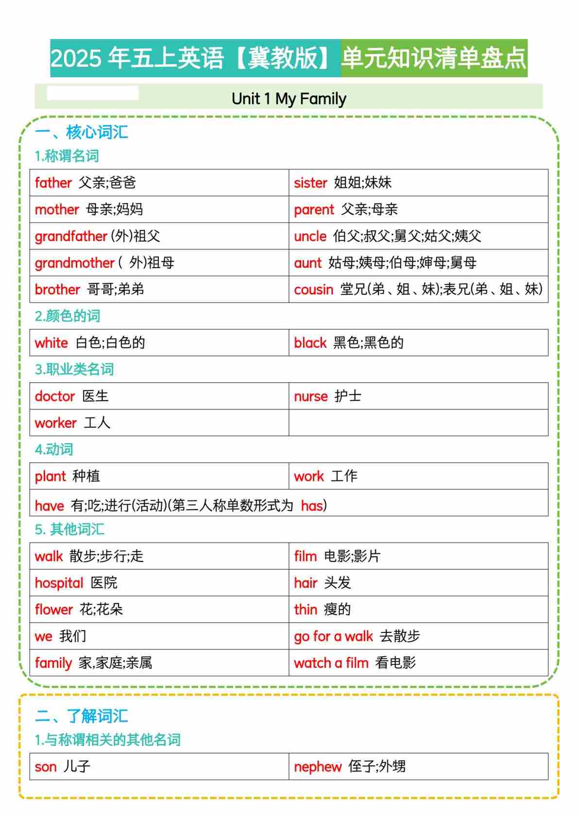 25五上英语冀教单元知识清单