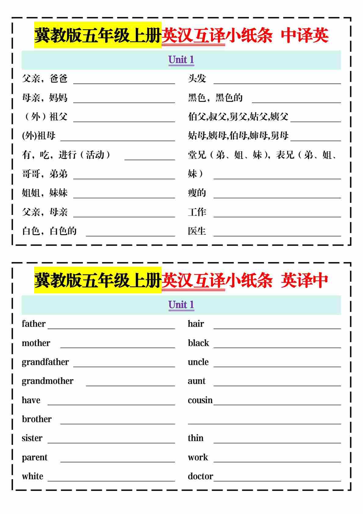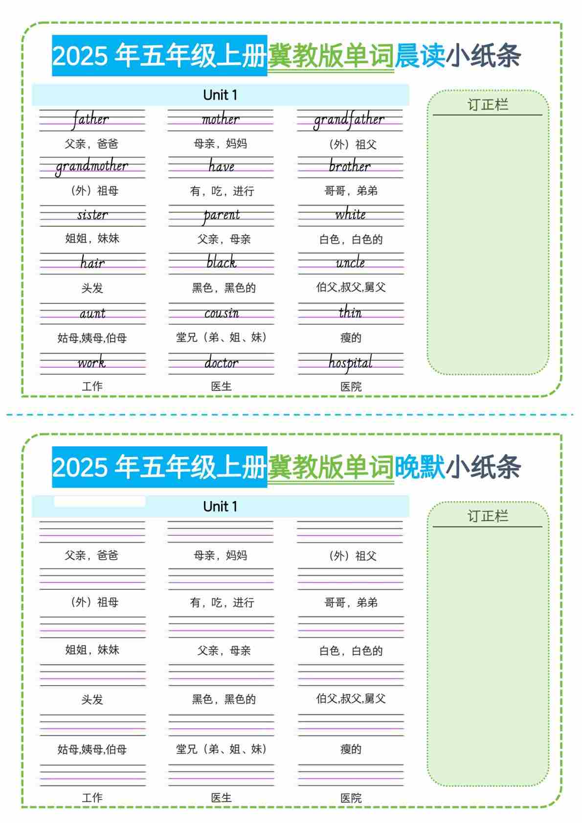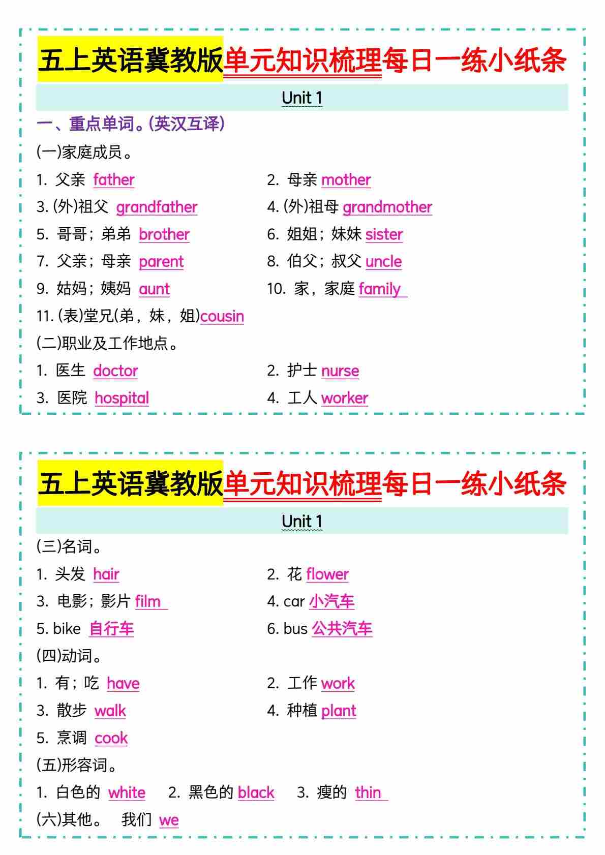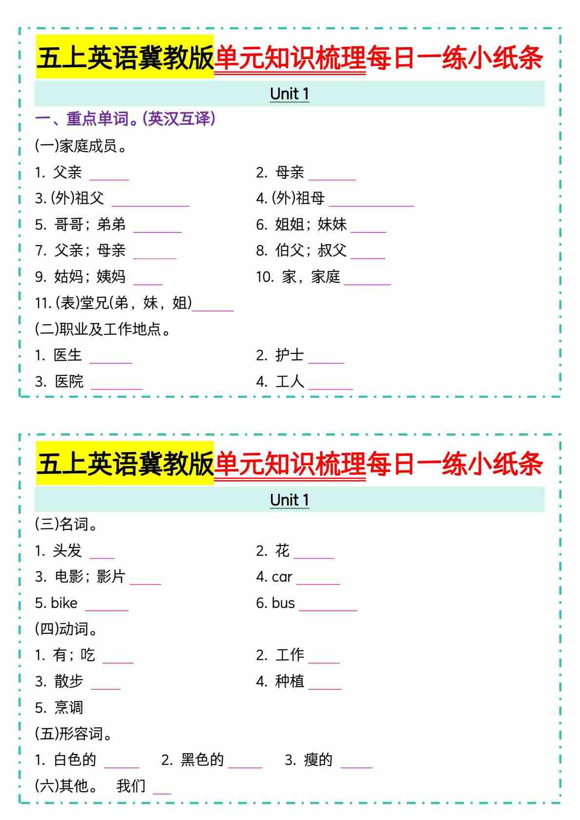 五上冀教版英语【单元知识梳理每日一练小纸条(空白)】