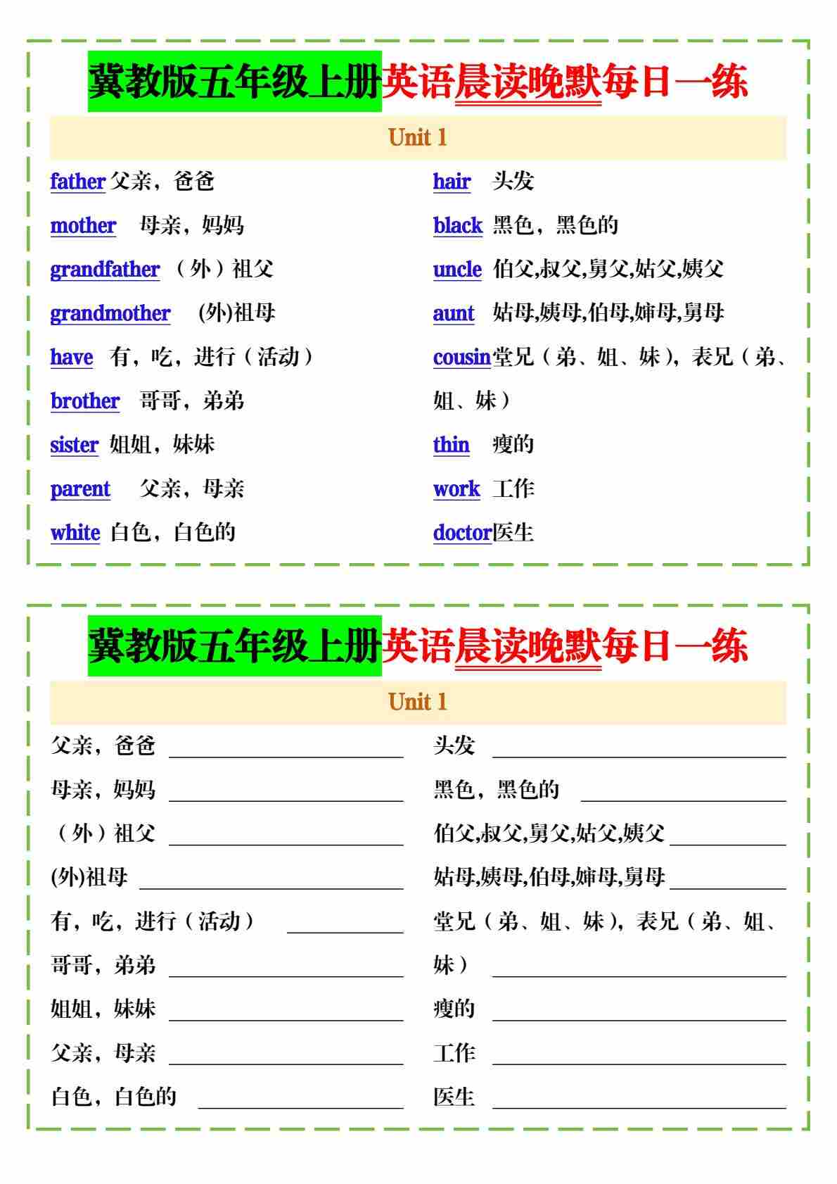 五上冀教版英语【晨读晚默每日一练】