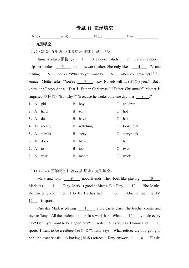 专题11 完形填空类汇编