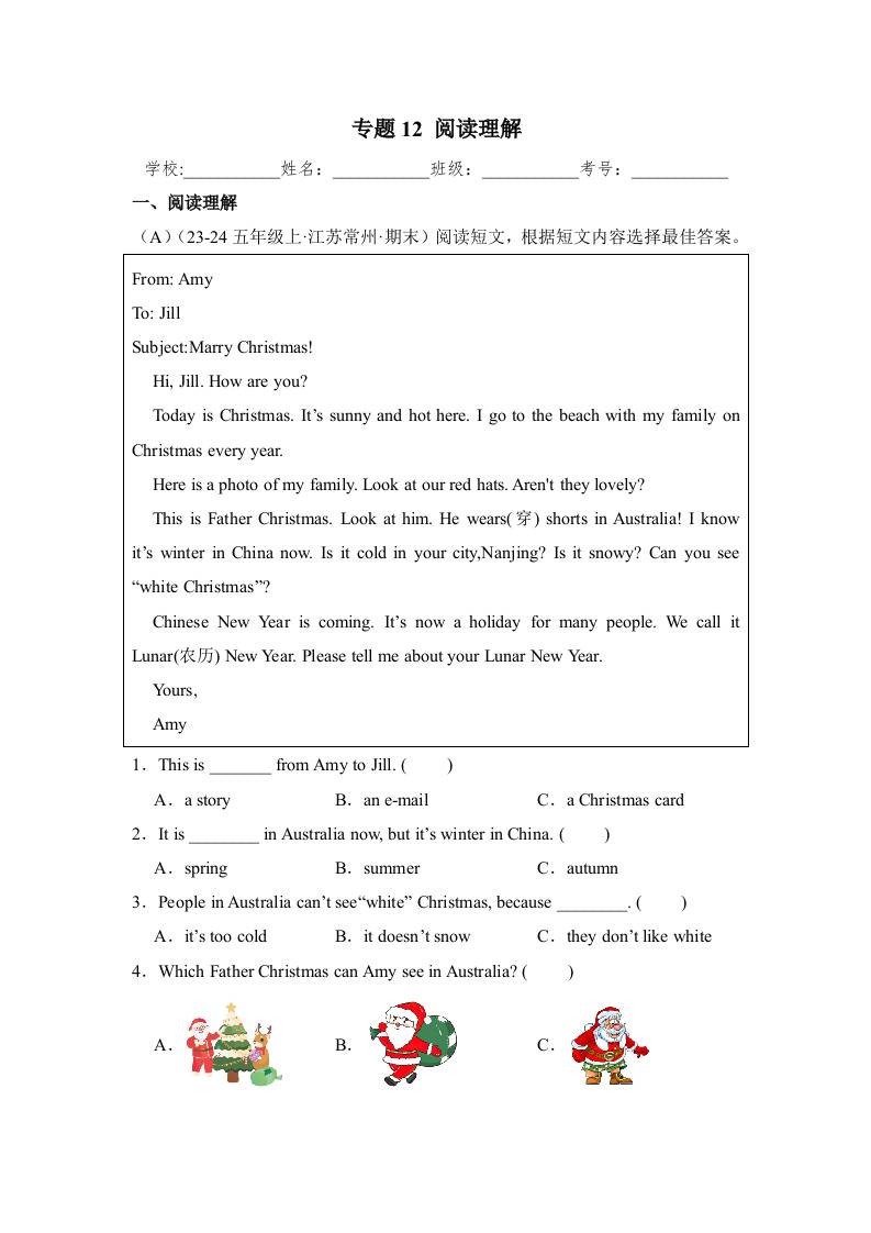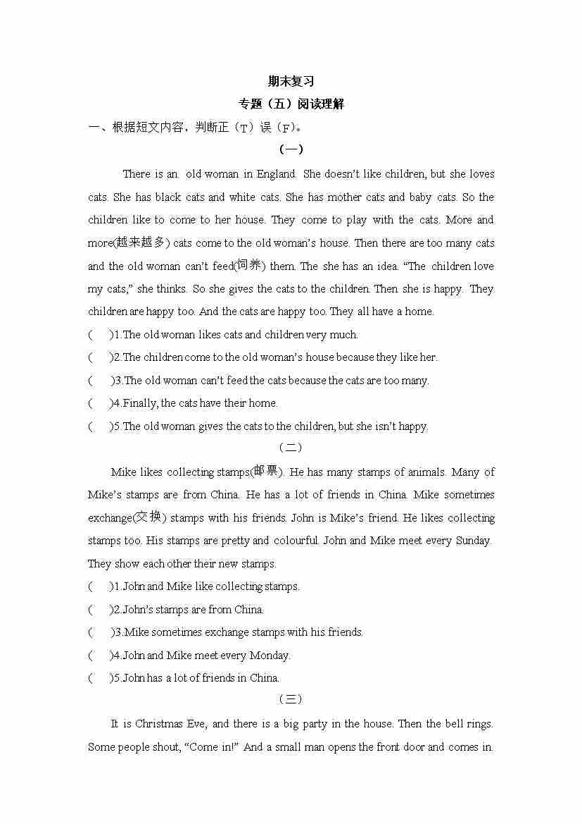 五年级上册英语期末专项训练(五)阅读理解 译林版(word版,含答案)