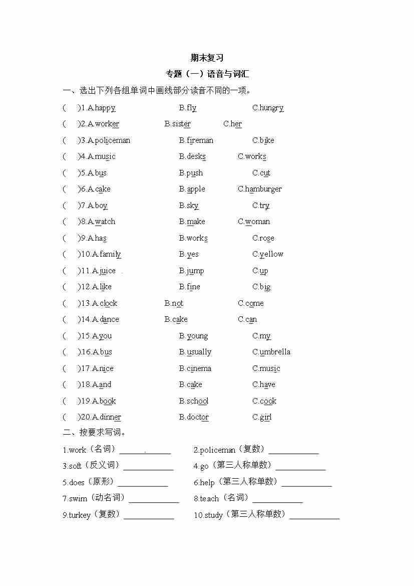 五年级上册英语期末专项训练(一)语音和词汇 译林版(word版,含答案)
