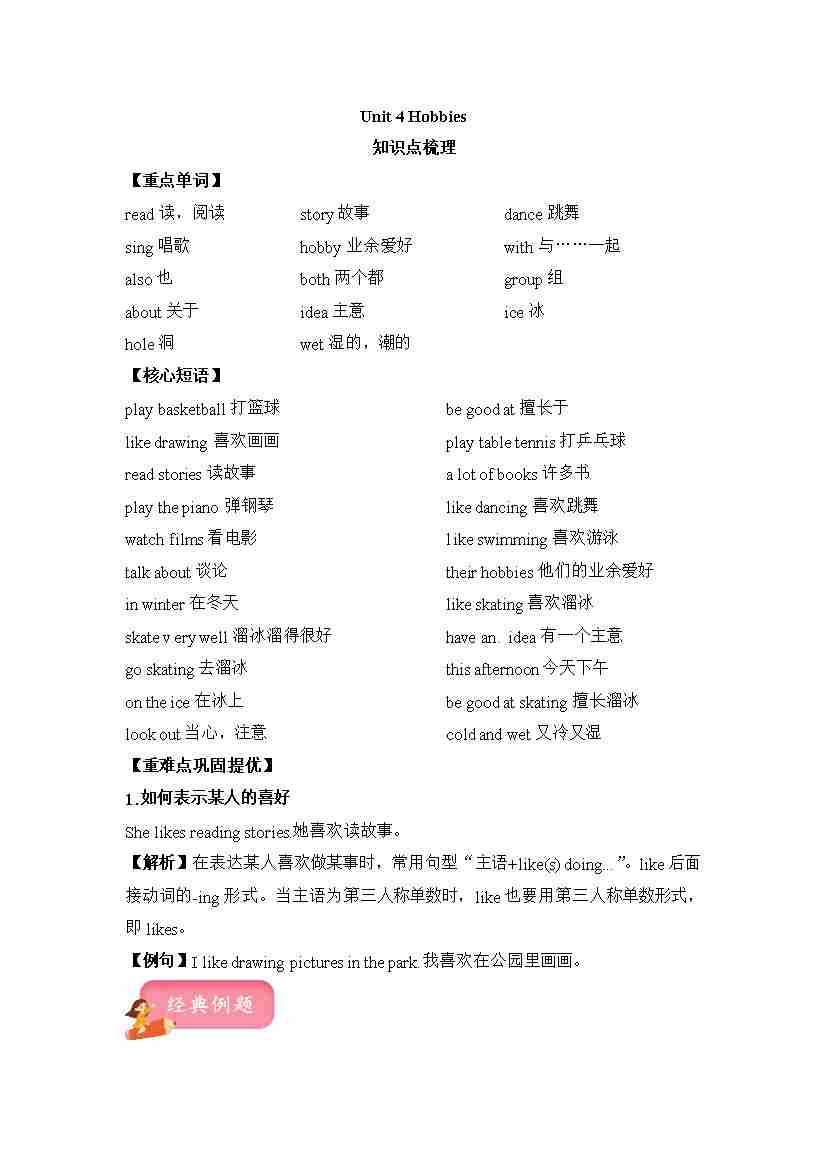五年级上册英语讲义(梳理 讲解 典例 习题)-Unit 4 Hobbies 译林三起