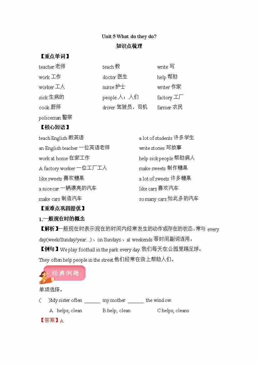 五年级上册英语讲义(梳理 讲解 典例 习题)-Unit 5 What do they do 译林三起