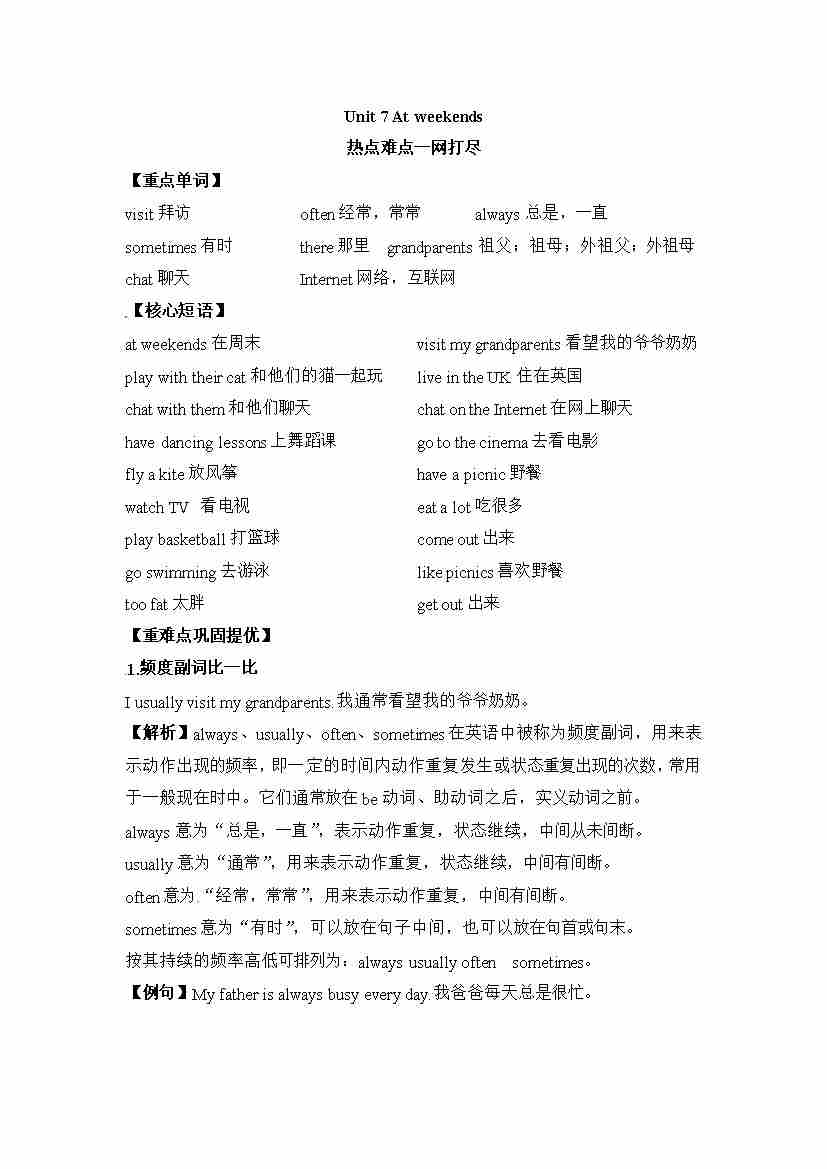 五年级上册英语讲义(梳理 讲解 典例 习题)-Unit 7 At weekends 译林三起
