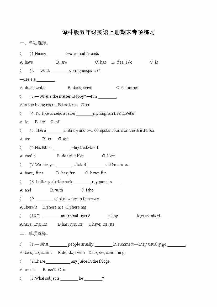 五年级英语上册期末专项练习 -单项选择1 译林版三起 (word版,含答案)