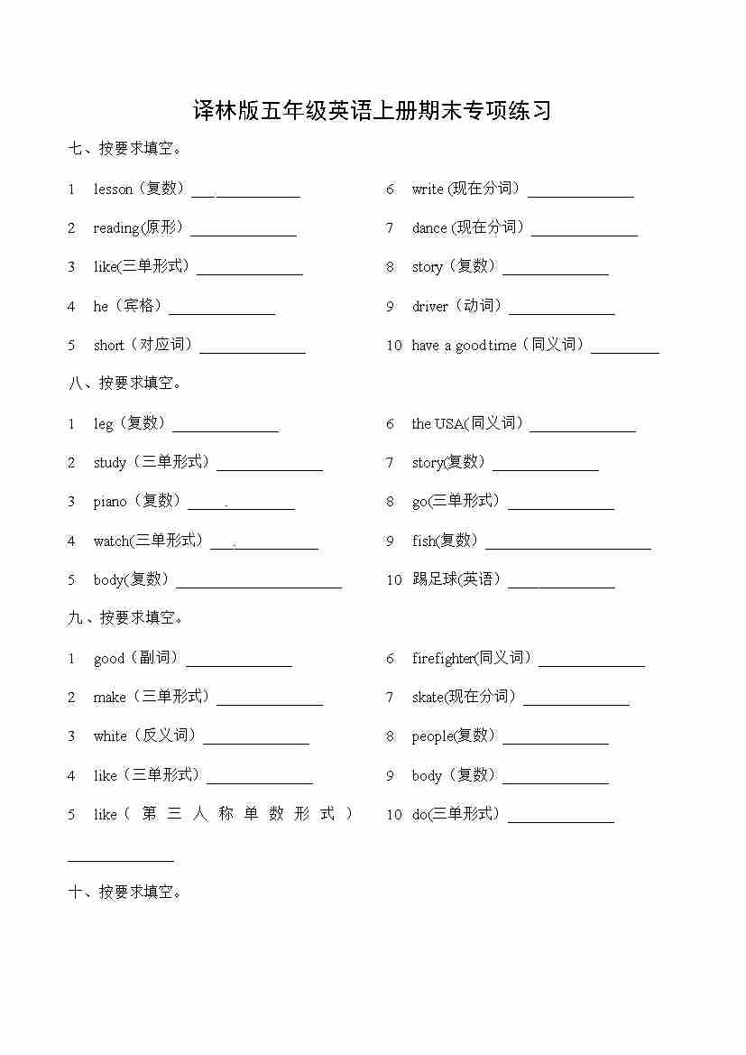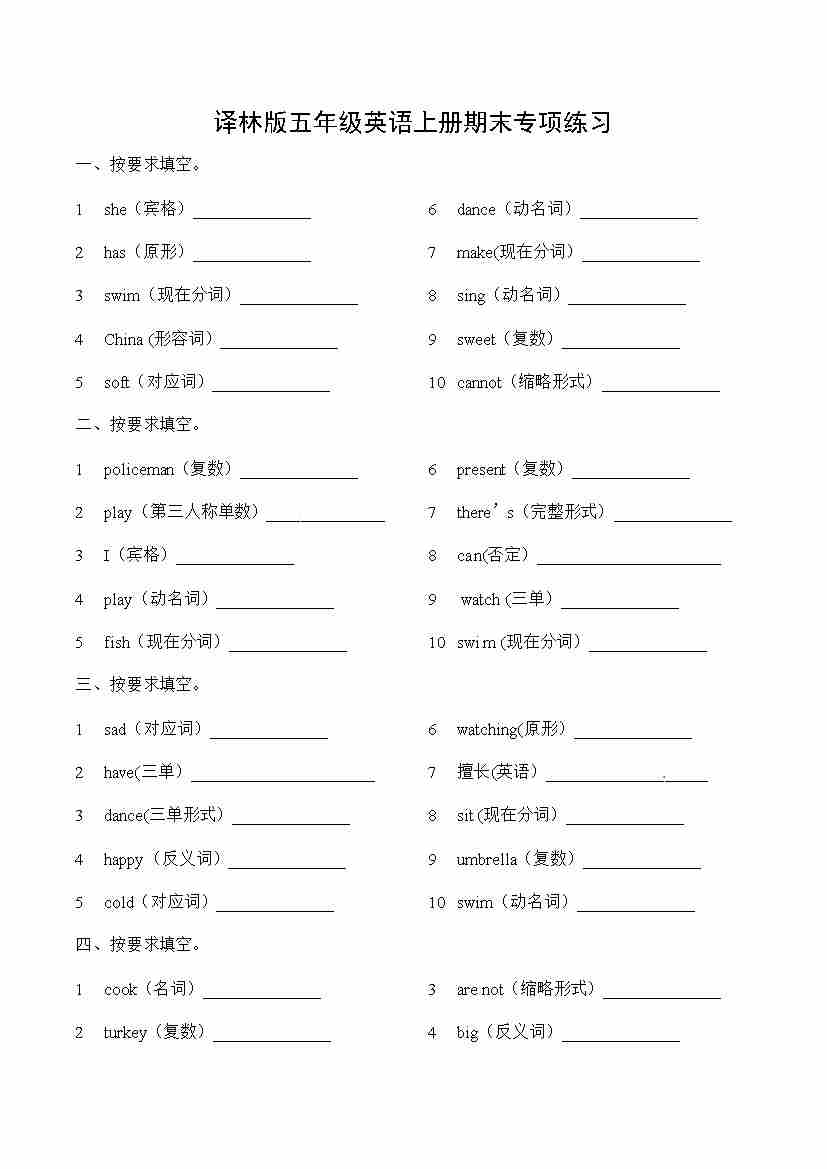 五年级英语上册期末专项练习 -按要求填空 译林版三起 (word版,含答案)