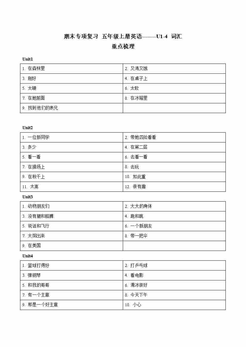专题01 U1-4词汇-五年级英语上册寒假专项提升(学生版)(译林版三起)
