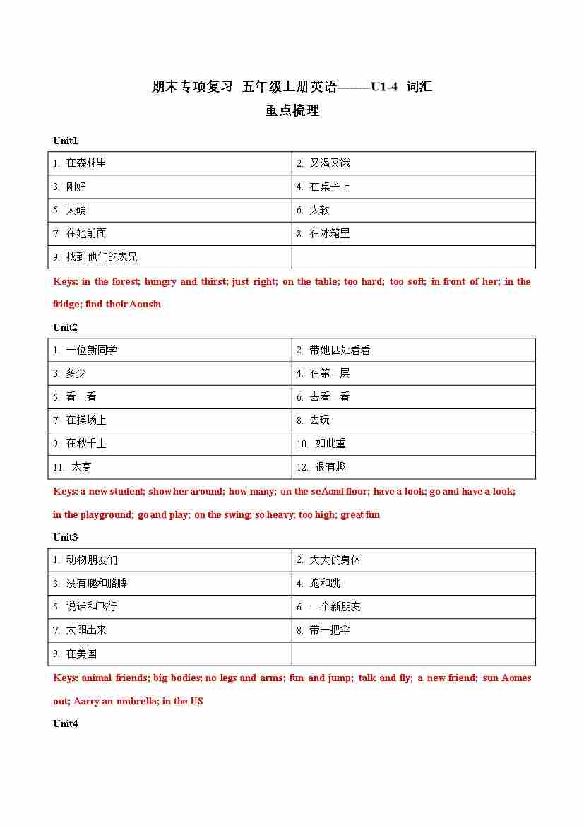 专题01 U1-4词汇-五年级英语上册寒假专项提升(教师版)(译林版三起)