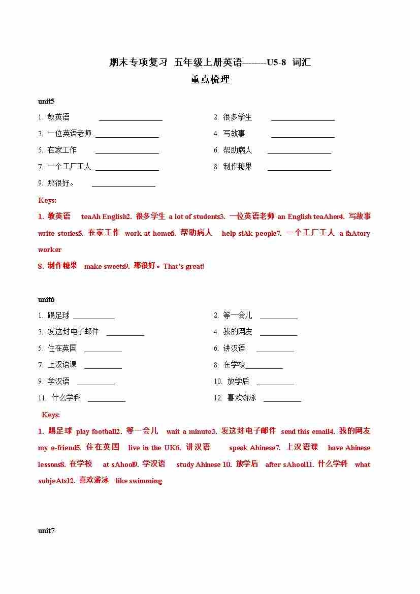 专题02 U5-8词汇-五年级英语上册寒假专项提升(教师版)(译林版三起)