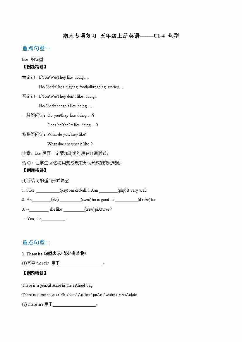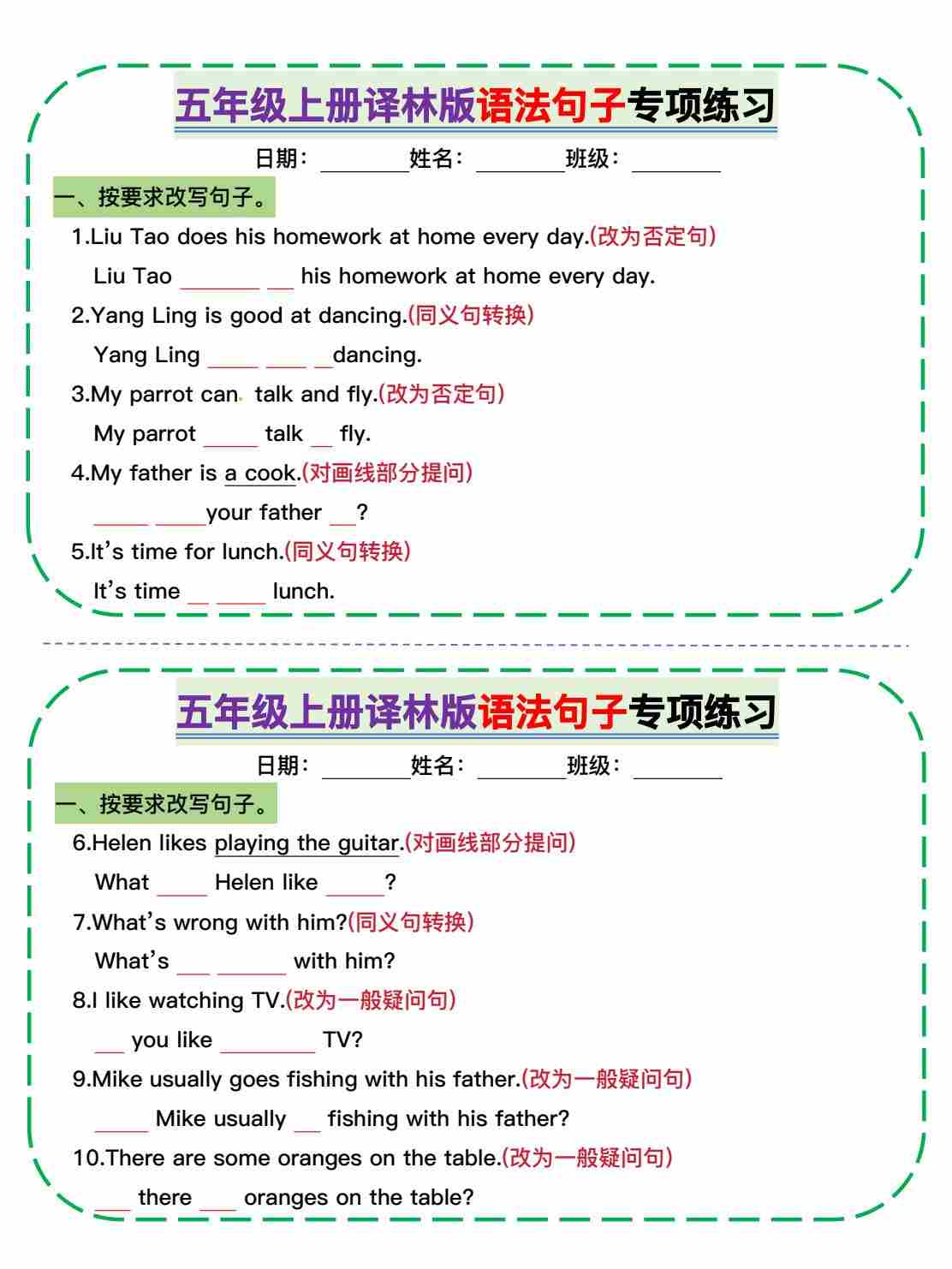 五年级上册译林版语法句子专项小纸条