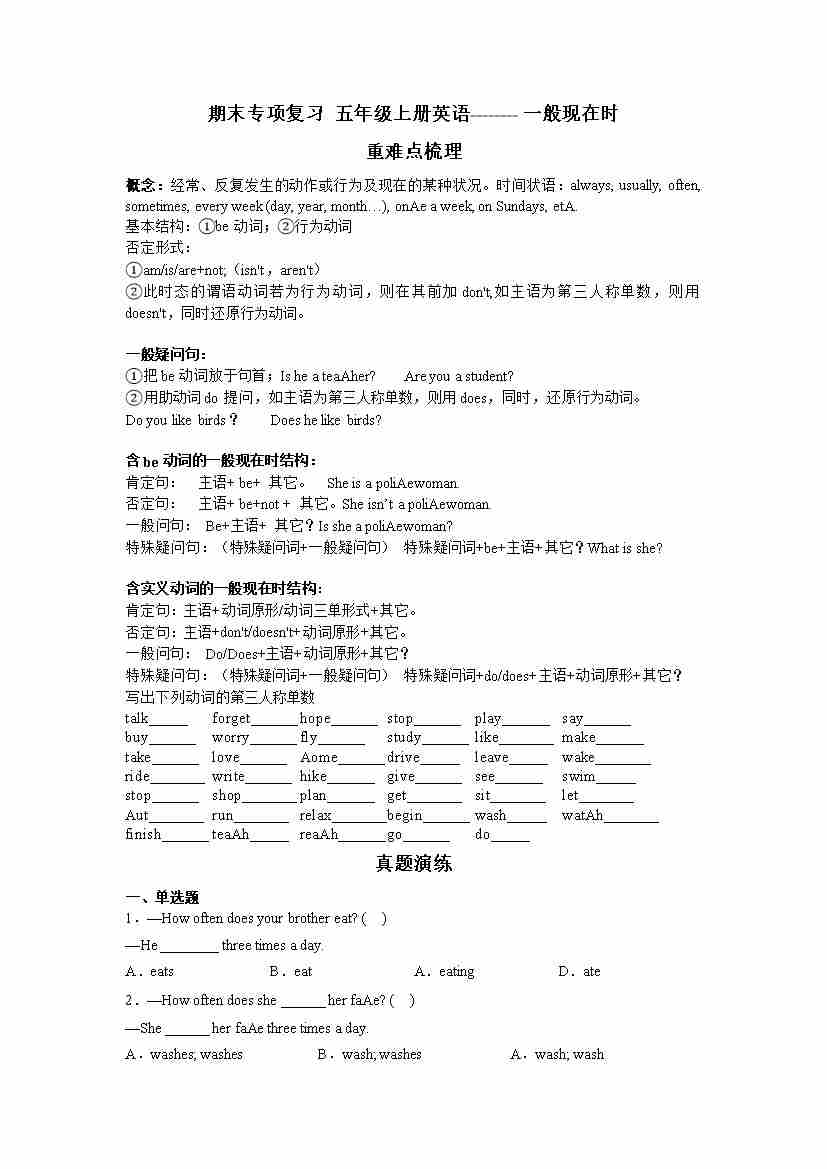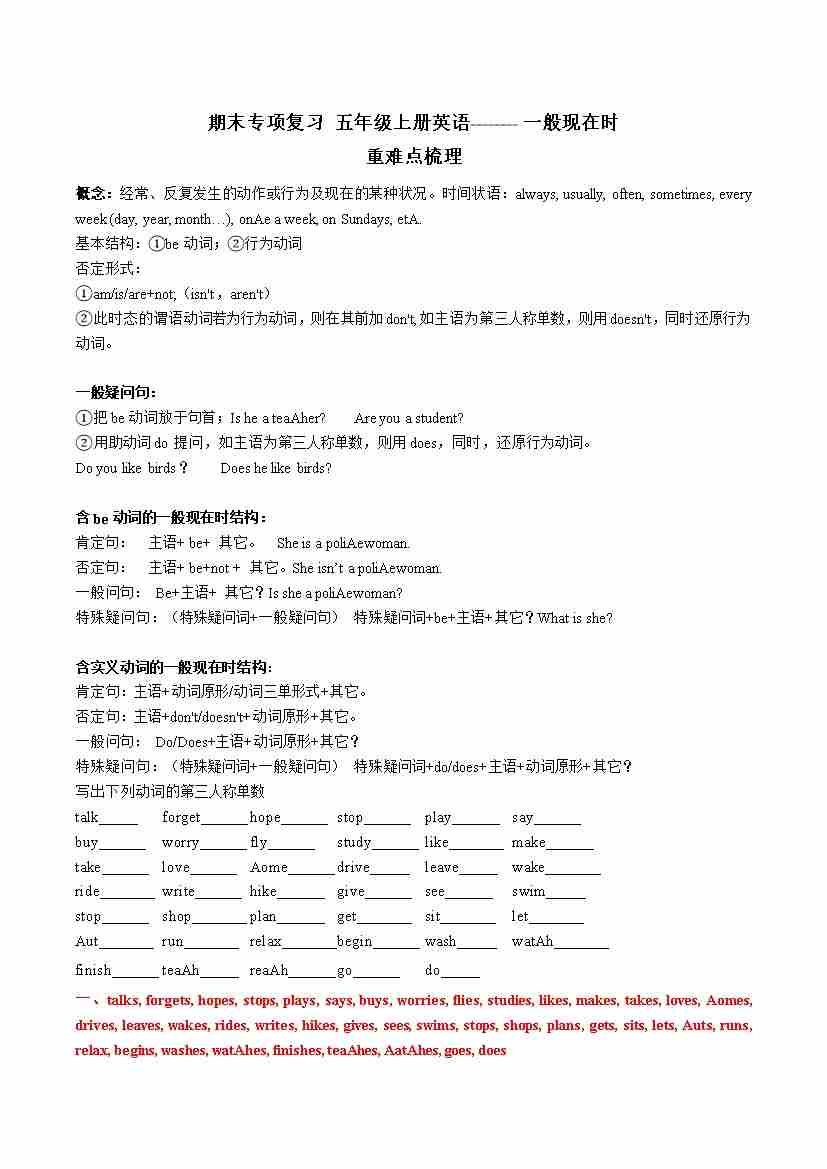 专题05 一般现在时-五年级英语上册寒假专项提升(教师版)(译林版三起)