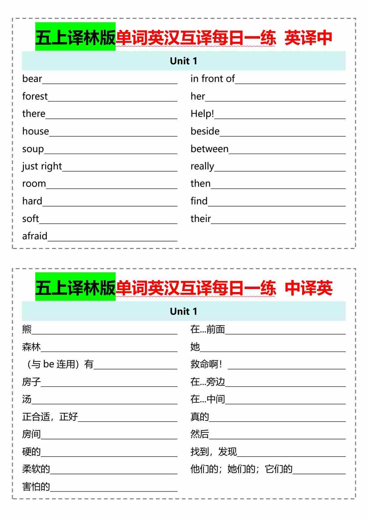 五上译林版单词英汉互译每日一练