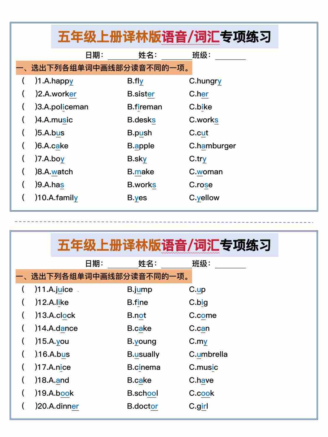 五年级上册译林版语音词汇专项小纸条