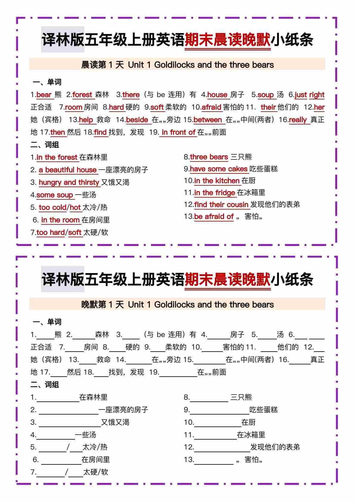 译林版五年级上册英语期末晨读晚默小纸条