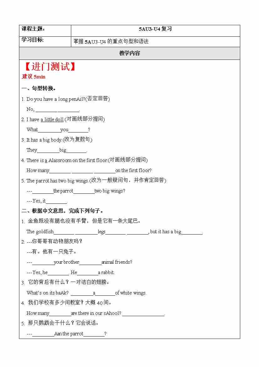 五年级英语寒假讲义第2讲 5A U3-U4复习 (教师版) 译林版(三起)