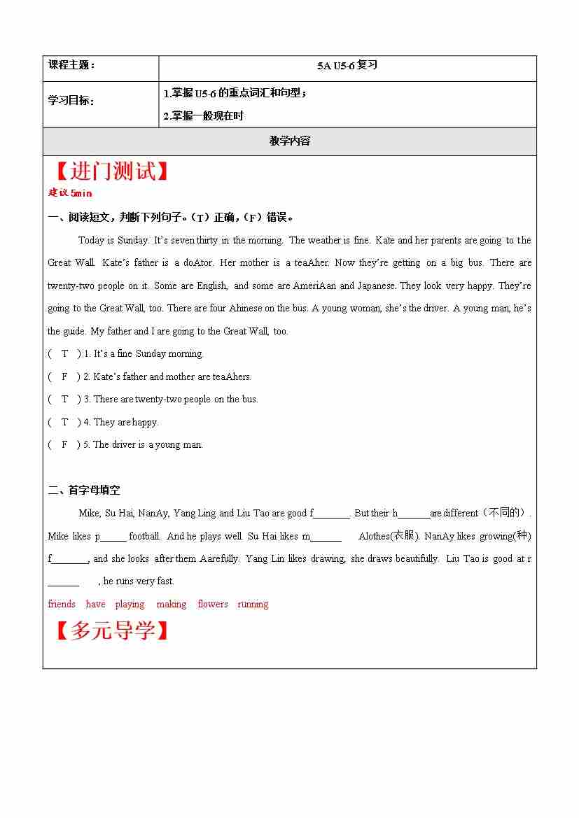 五年级英语寒假讲义第3讲 5A U5-U6复习 (教师版) 译林版(三起)