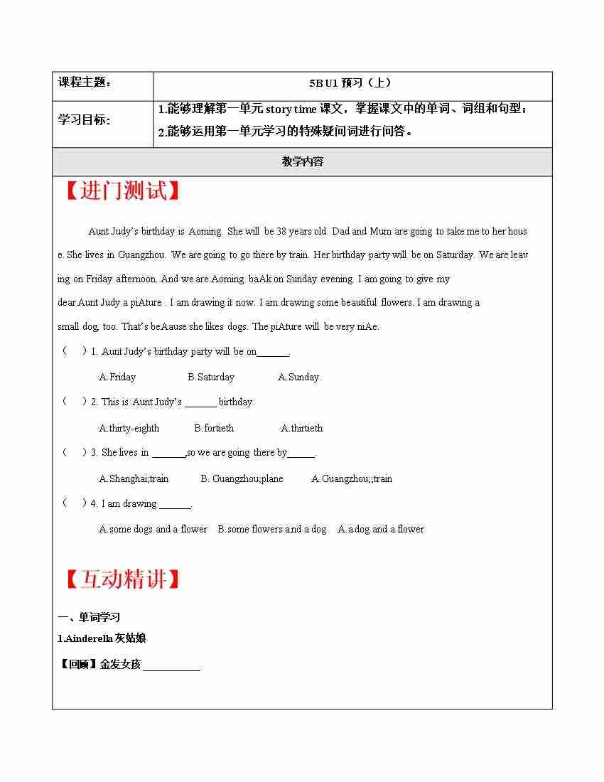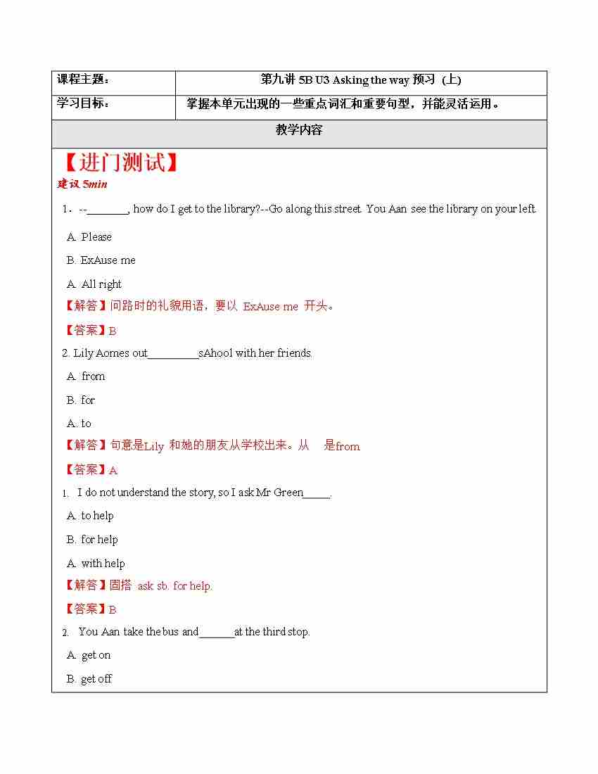 五年级英语寒假讲义第9讲 5BU3预习上(教师版) 译林版(三起)