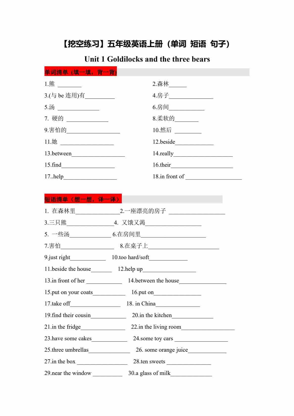 译林版【挖空练习】五年级上册英语( 单词 短语 句子)-Unit 1 Goldilocks and the three bears译林版(含答案)