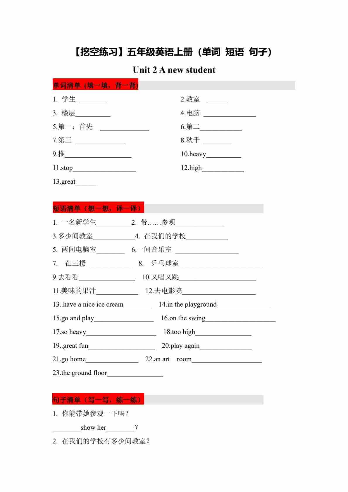译林版【挖空练习】五年级上册英语( 单词 短语 句子)-Unit 2 A new student 译林版(含答案)