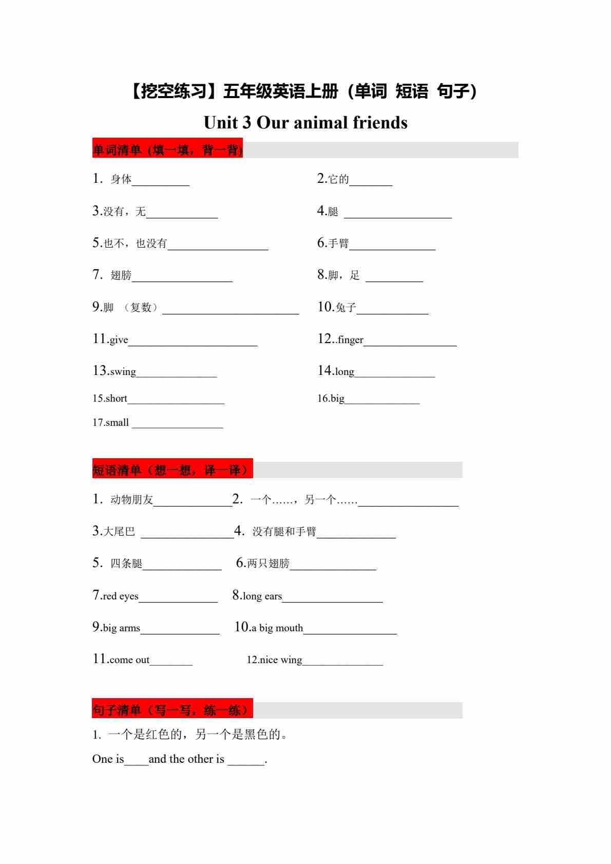 译林版【挖空练习】五年级上册英语( 单词 短语 句子)-Unit 3 Our animal friends 译林版(含答案)