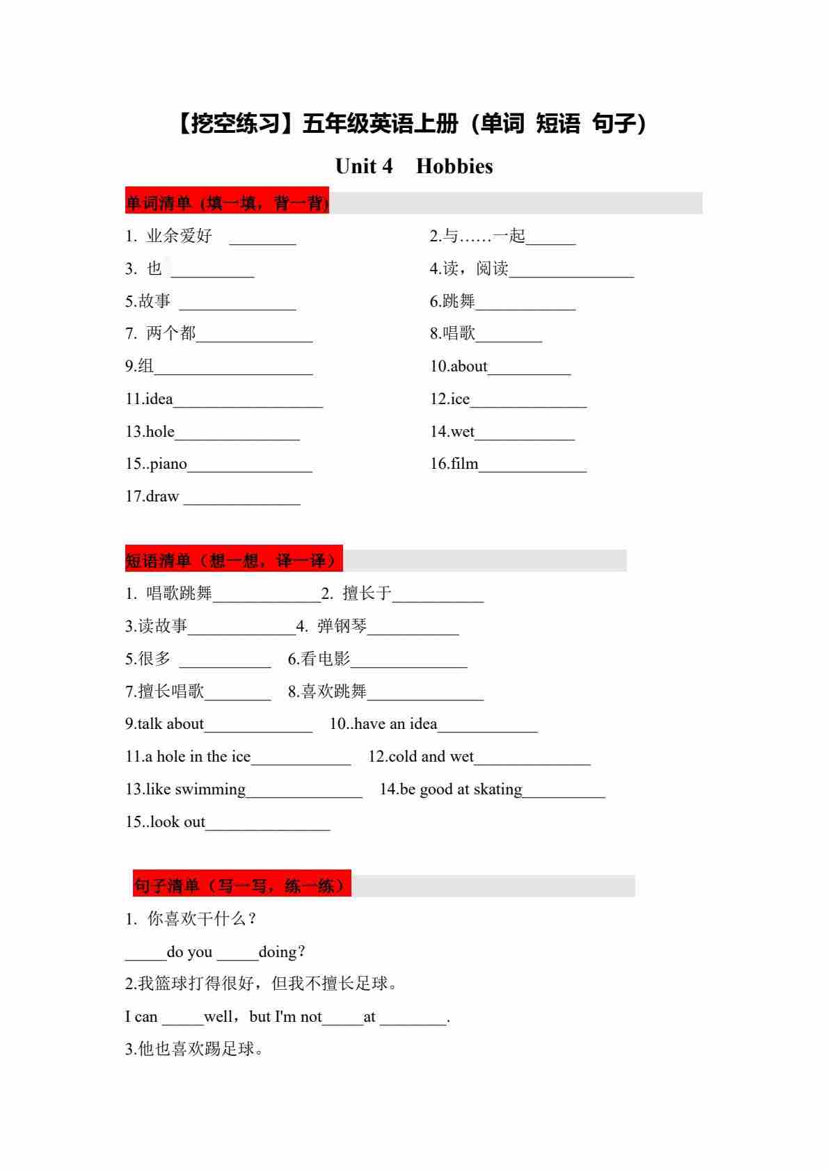 译林版【挖空练习】五年级上册英语( 单词 短语 句子)-Unit 4 Hobbies 译林版(含答案)