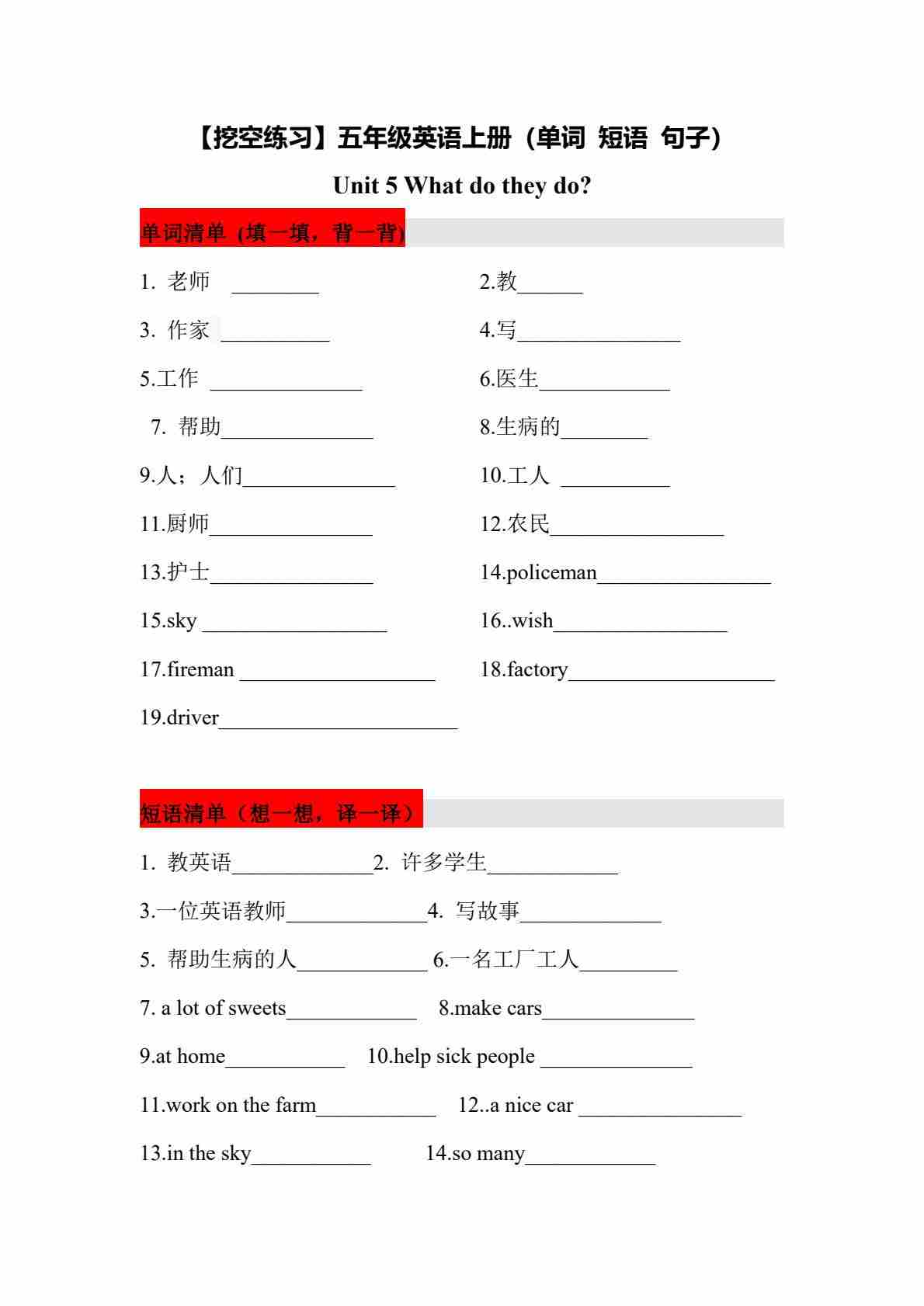 译林版【挖空练习】五年级上册英语( 单词 短语 句子)-Unit 5 What do they do 译林版(含答案)