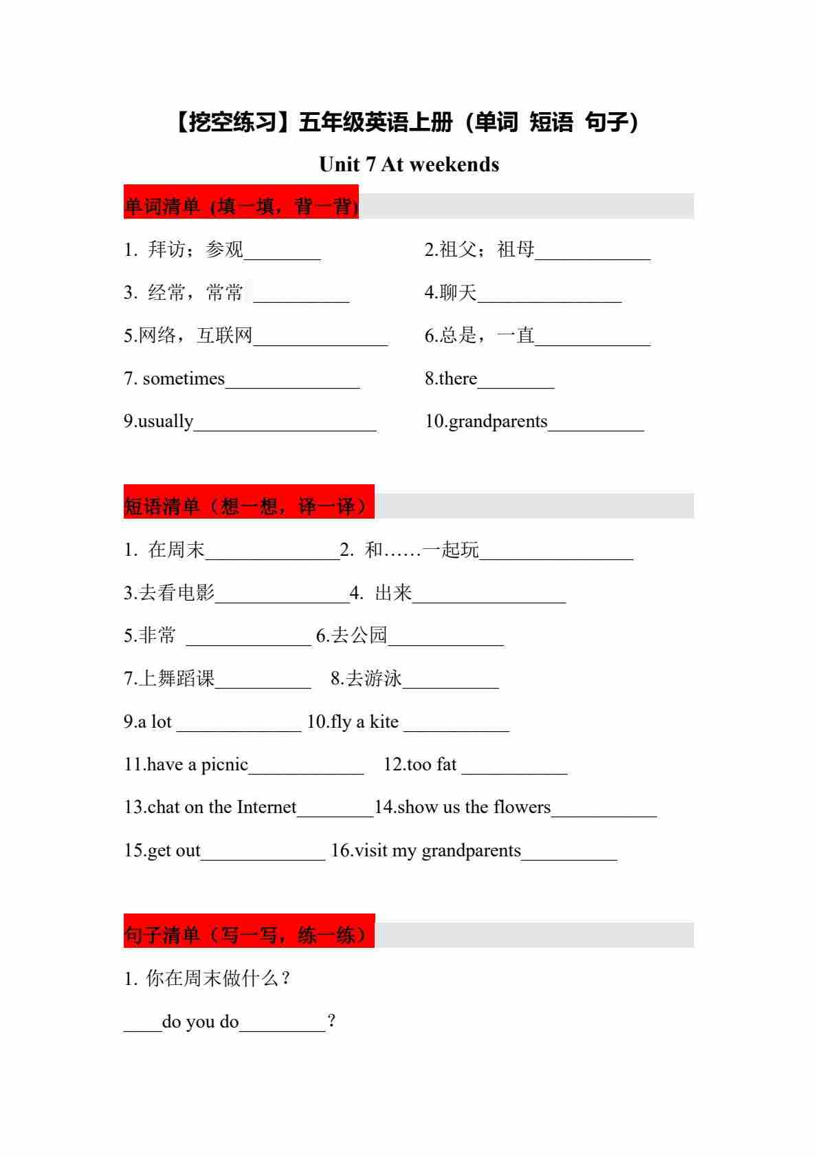 译林版【挖空练习】五年级上册英语( 单词 短语 句子)-Unit 7 At weekends 译林版(含答案)