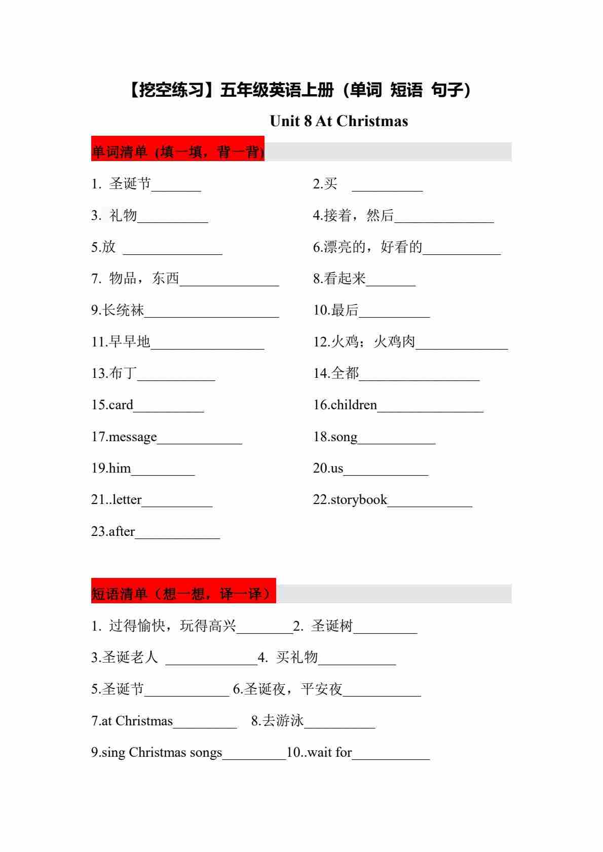 译林版【挖空练习】五年级上册英语( 单词 短语 句子)-Unit 8 At Christmas 译林版(含答案)