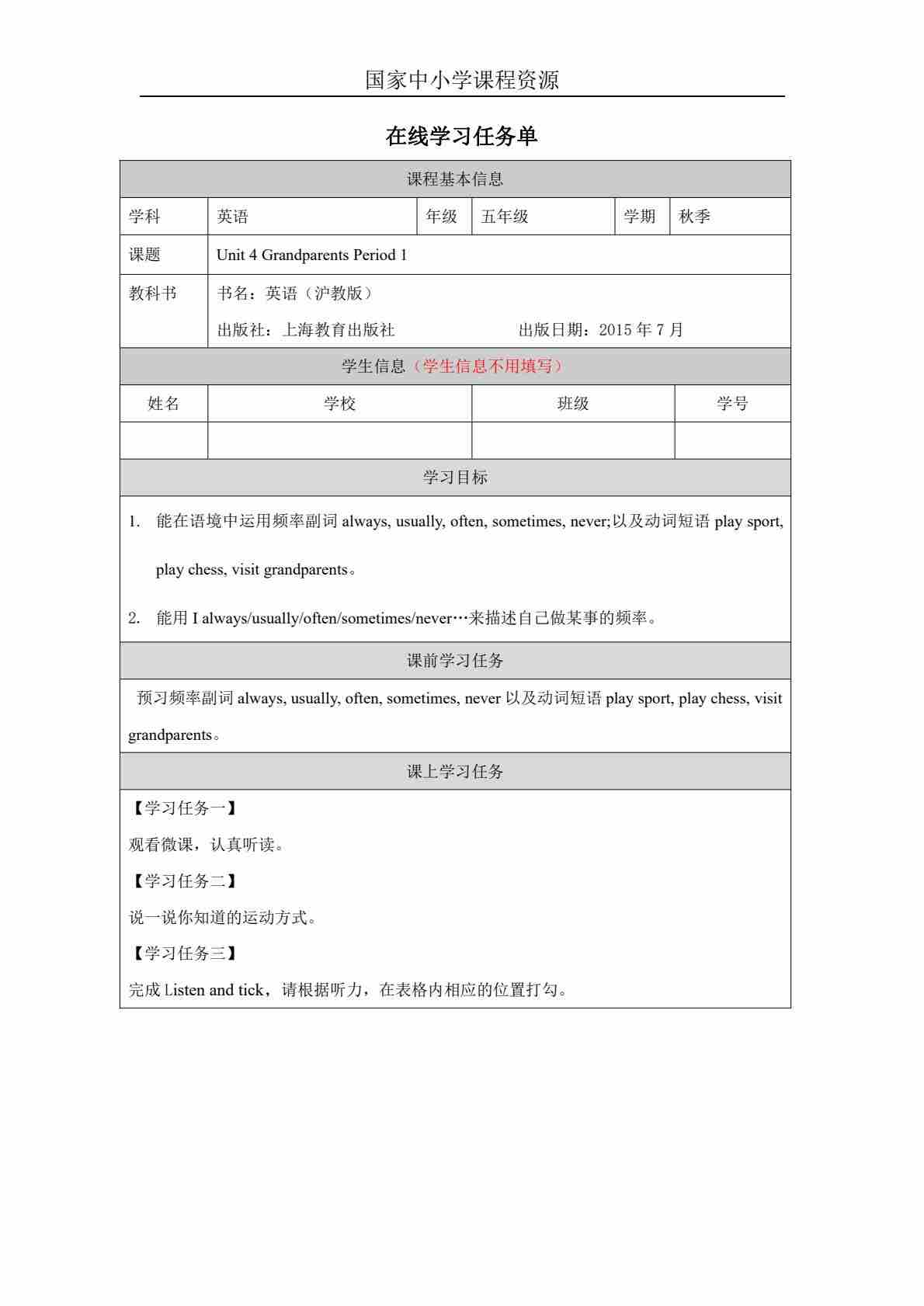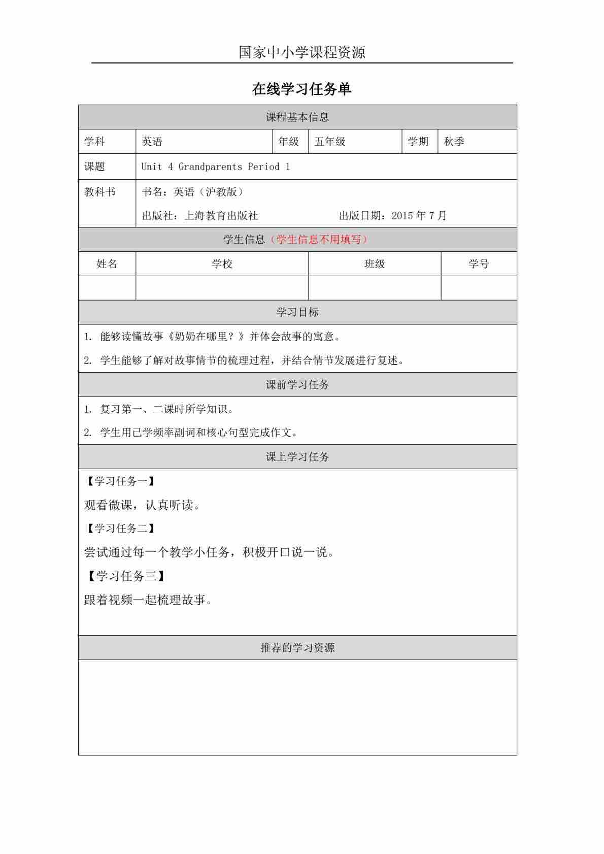 4 Unit 2 Period 1_学习任务单