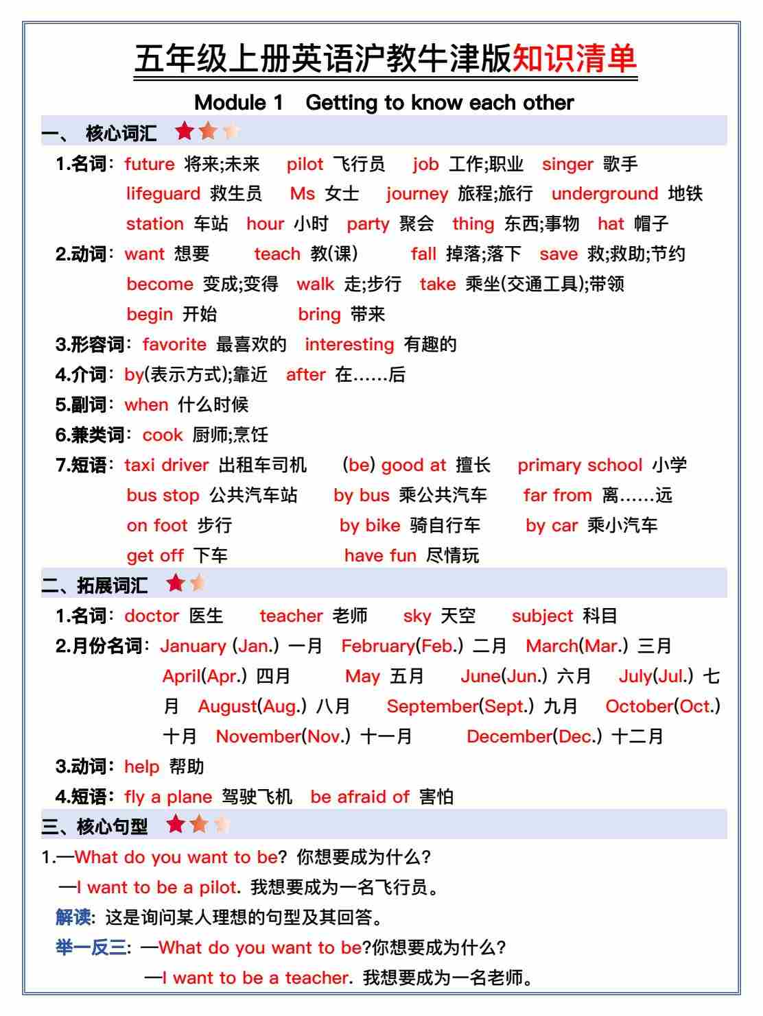 五年级上册英语沪教牛津版知识清单