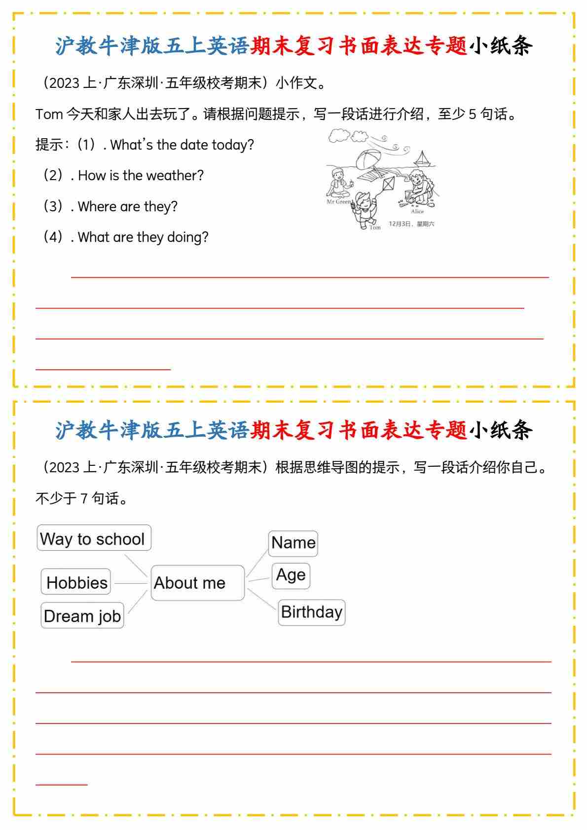 沪教牛津版五上英语期末复习书面表达专题小纸条
