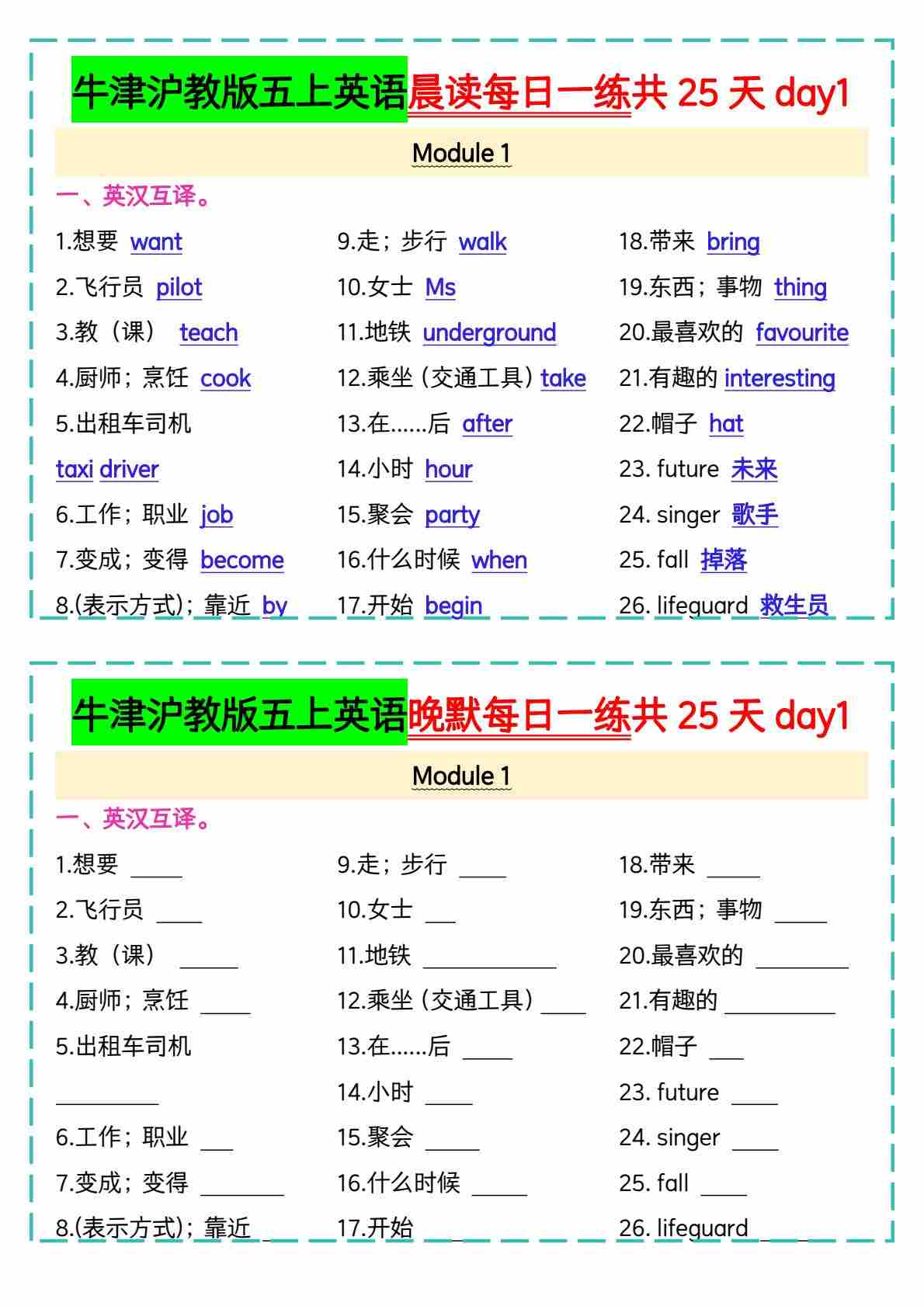 牛津沪教版五上英语晨读晚默每日一练
