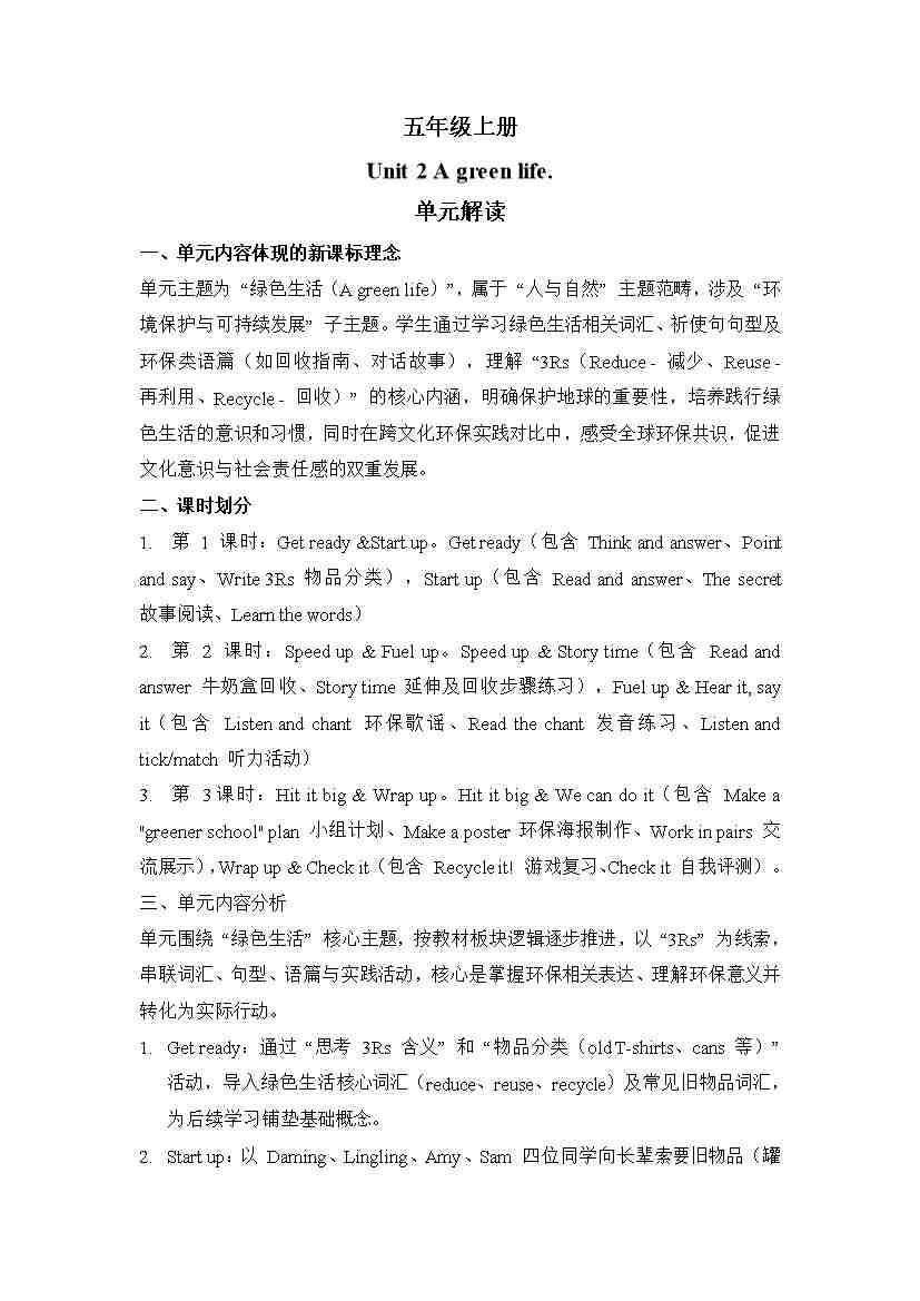 Unit2 A green life (单元解读讲义)英语外研版三起五年级上册(新教材)
