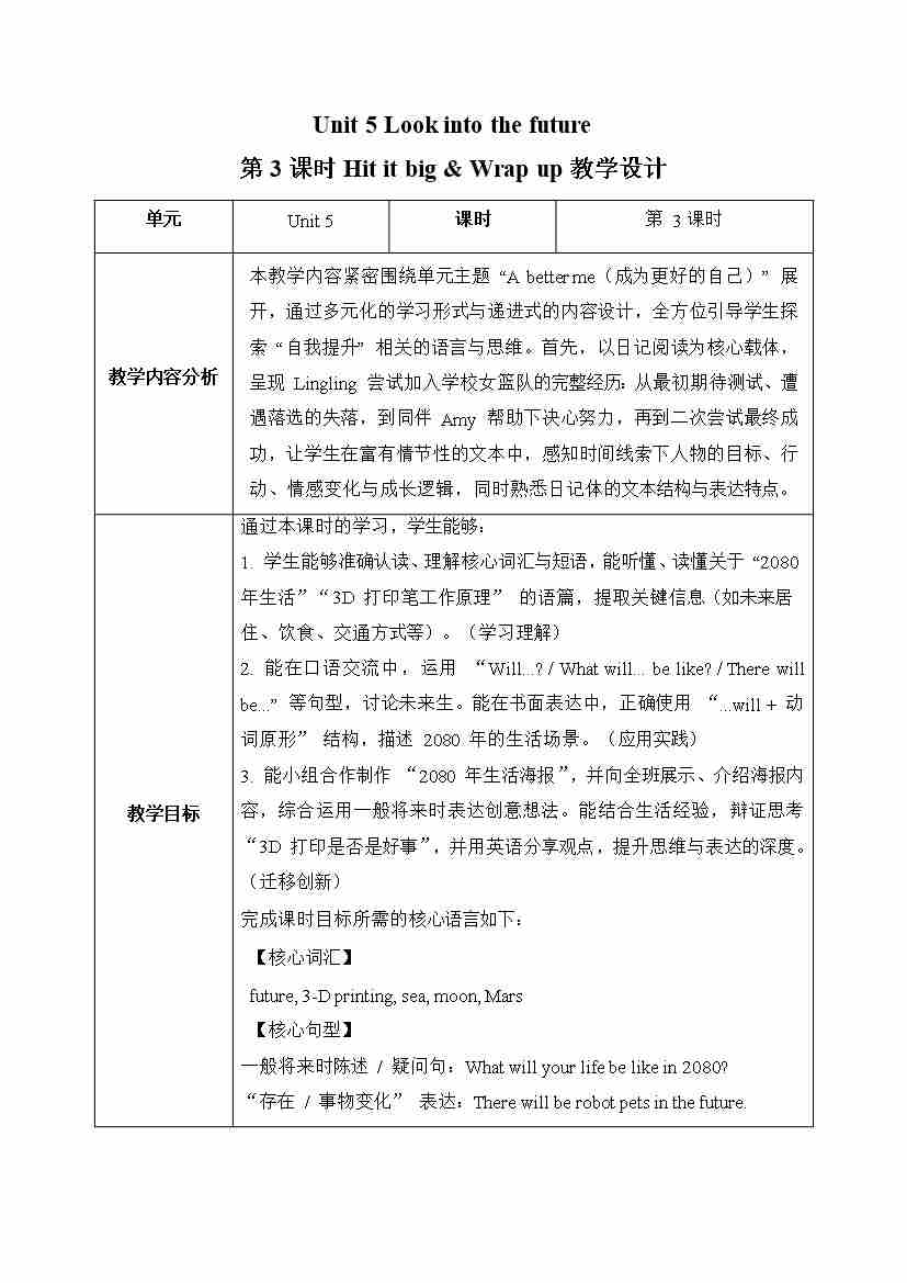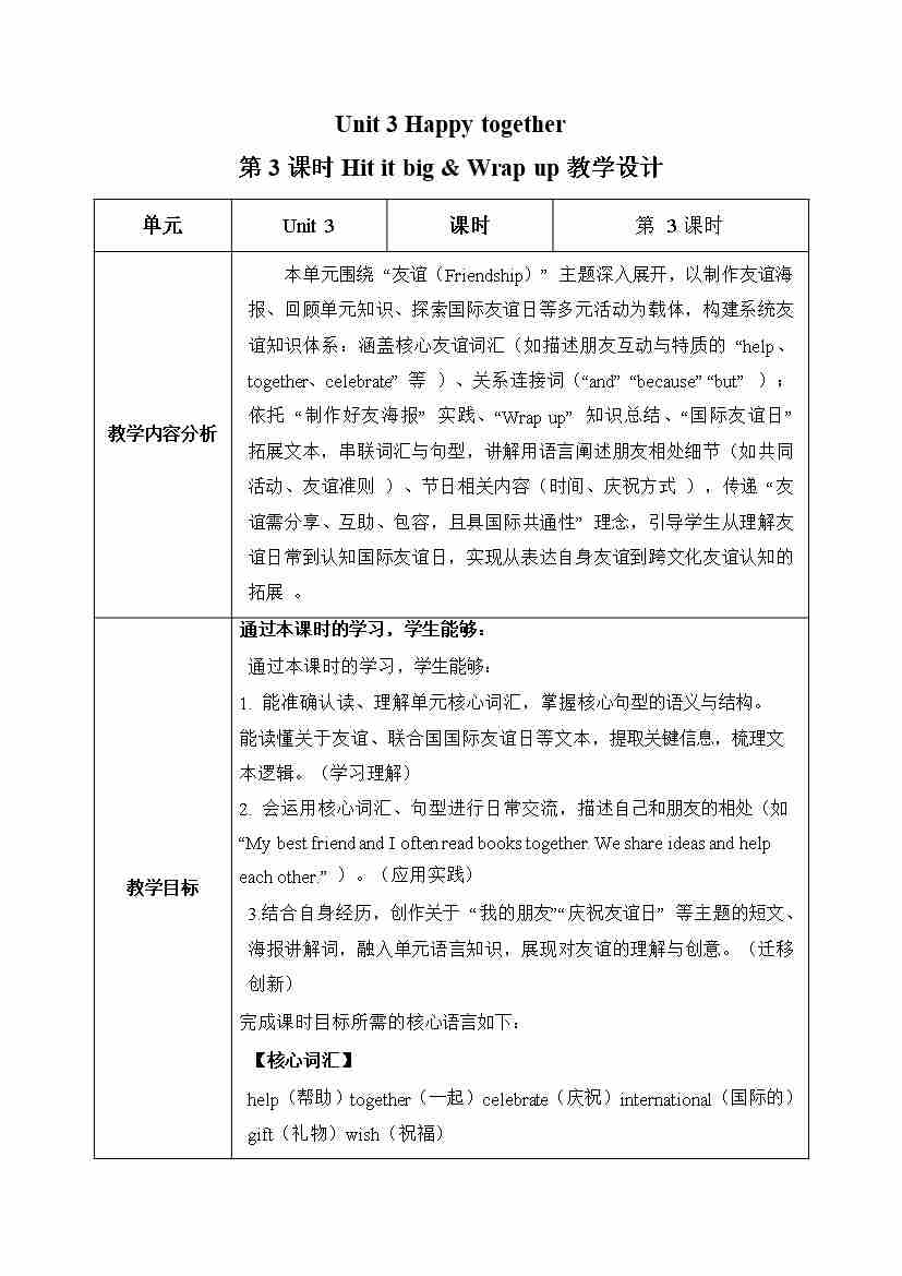 Unit 3 第3课时 Hit it big & Wrap up (教学设计)英语外研版三起五年级上册(新教材)
