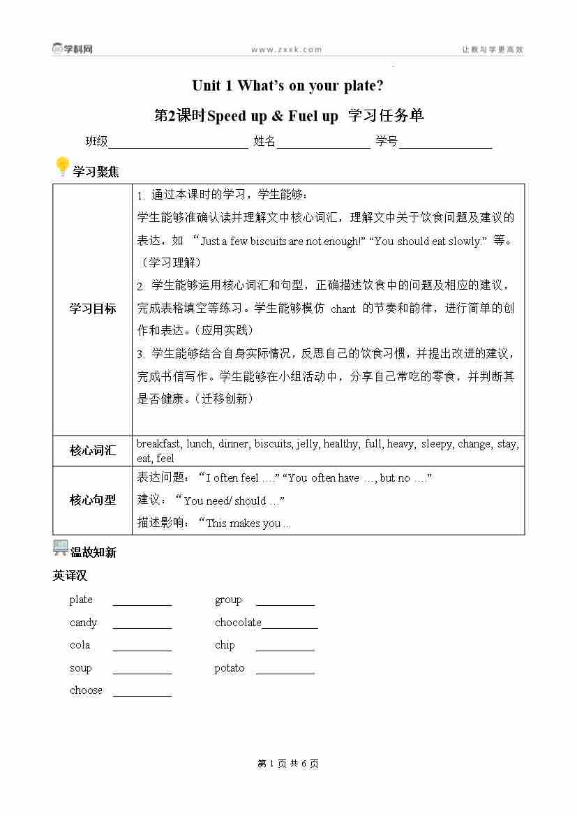 五上外研Unit 1 第2课时 Speed up & Fuel up (学习任务单)英语外研版三起五年级上册(新教材)2.