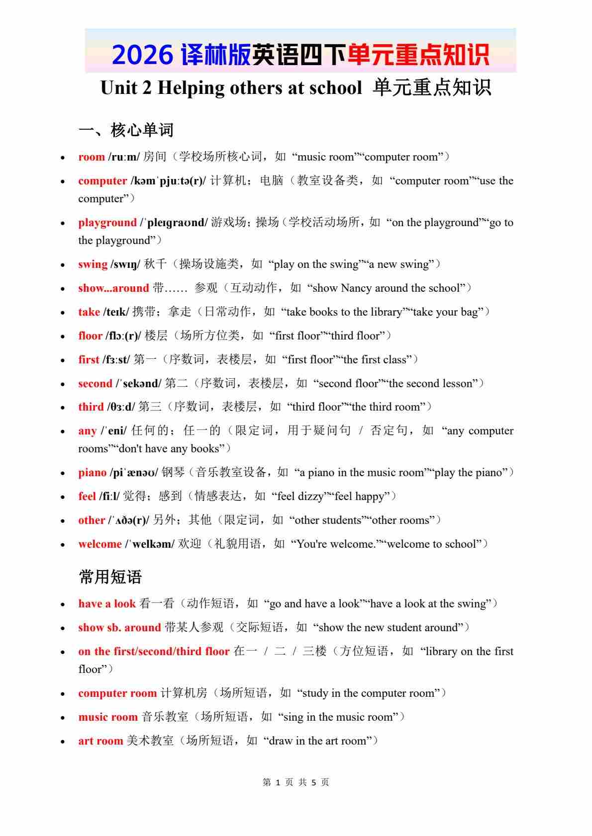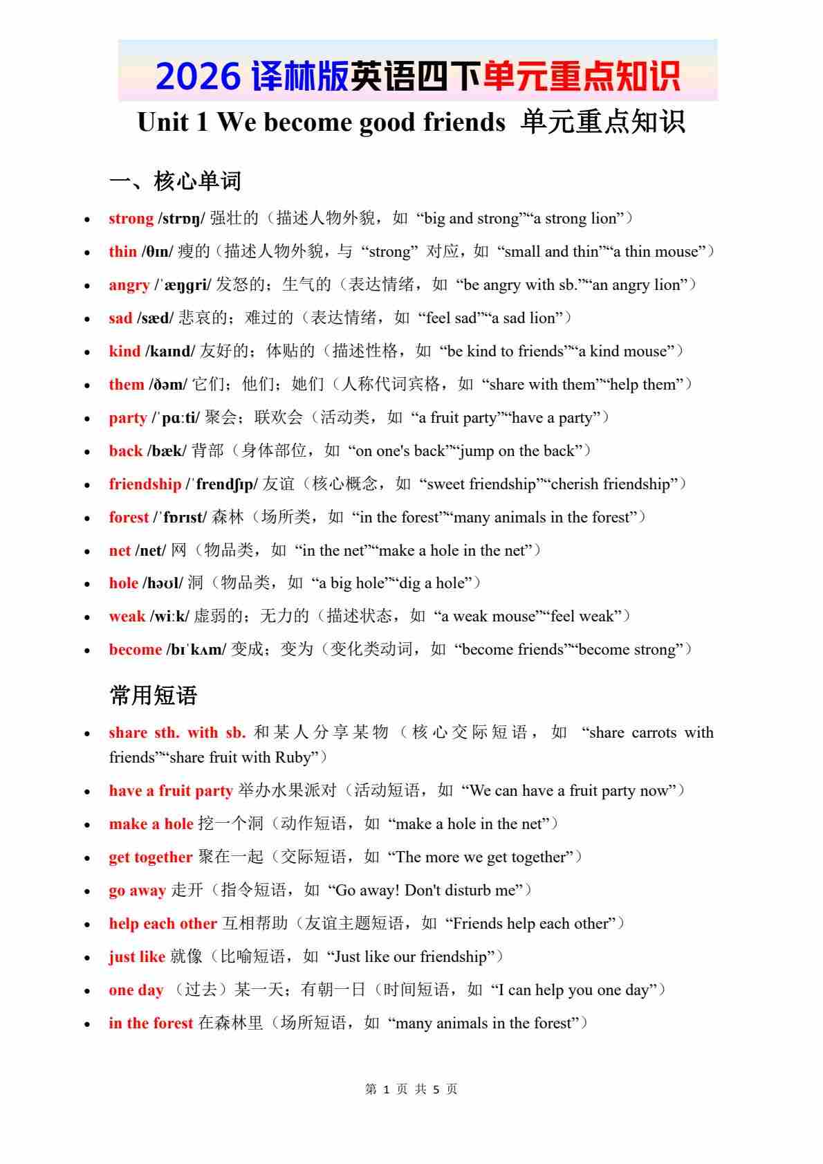 2026春译林版英语四下知识清单 Unit 1