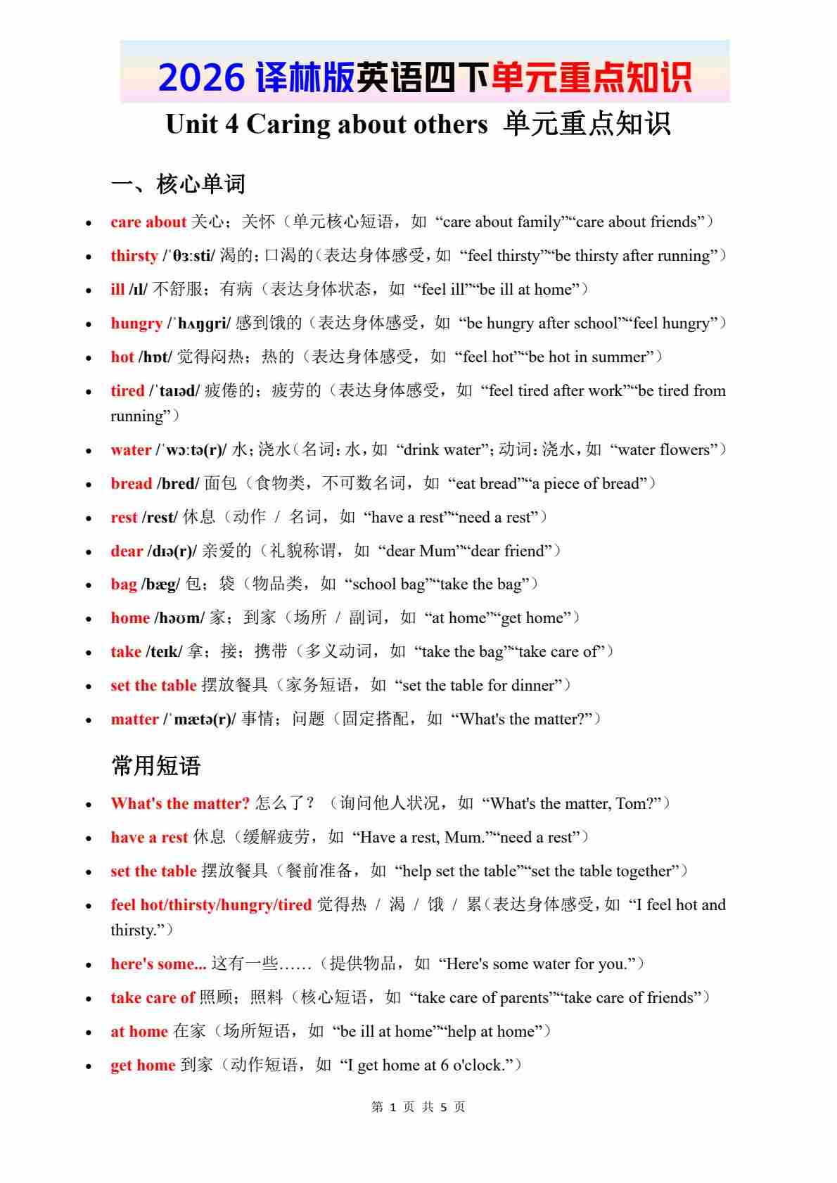 2026春译林版英语四下单元重点知识 Unit 1