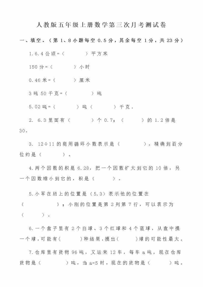【人教】五上数学第3次月考测试卷