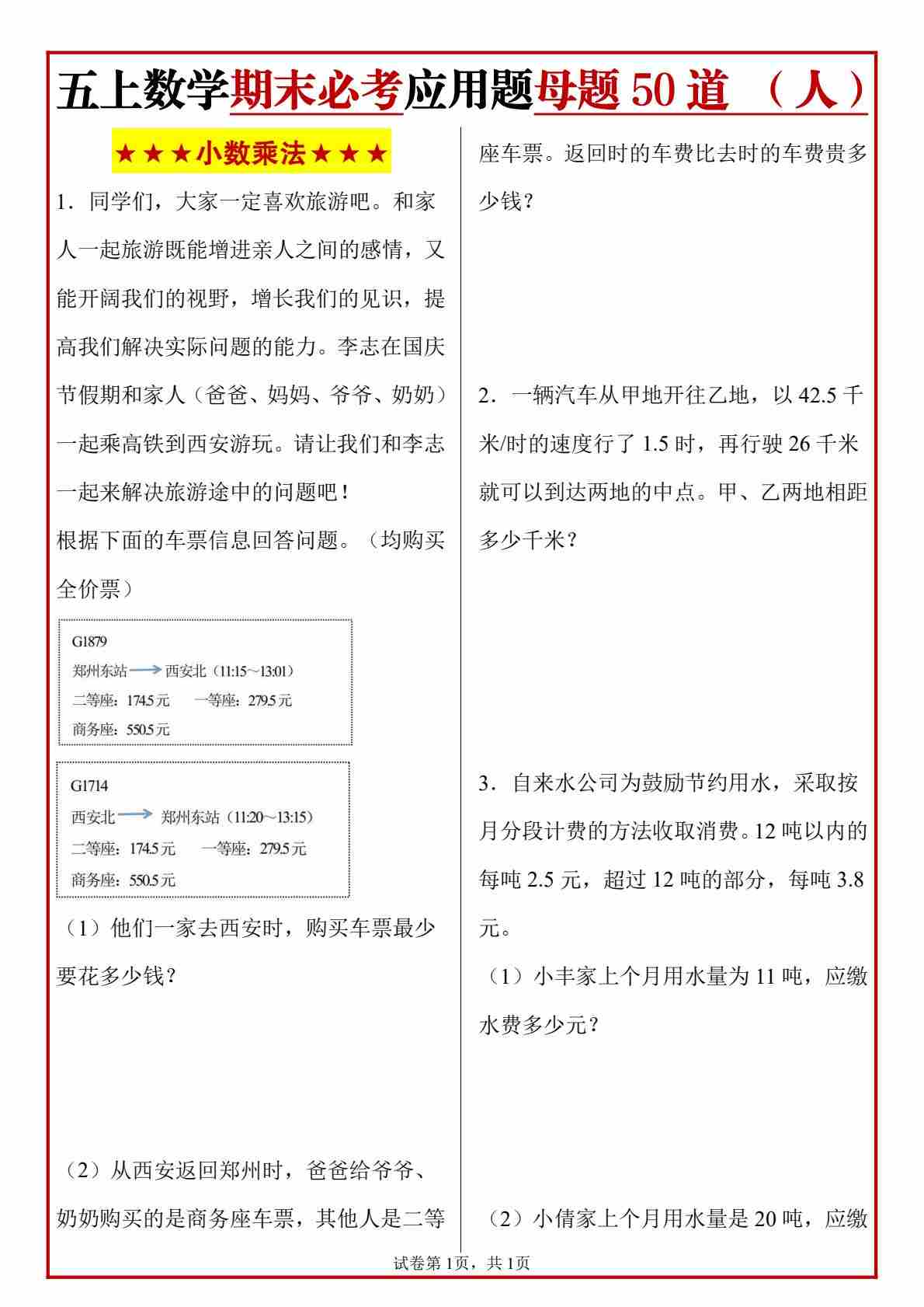 五上人教版数学【期末必考应用题母题50道】.