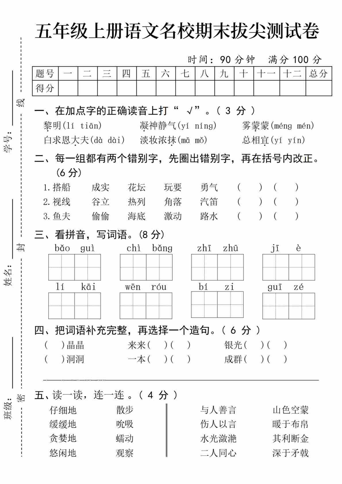 五(上)语文名校期末拔尖测试卷-黎明-SY