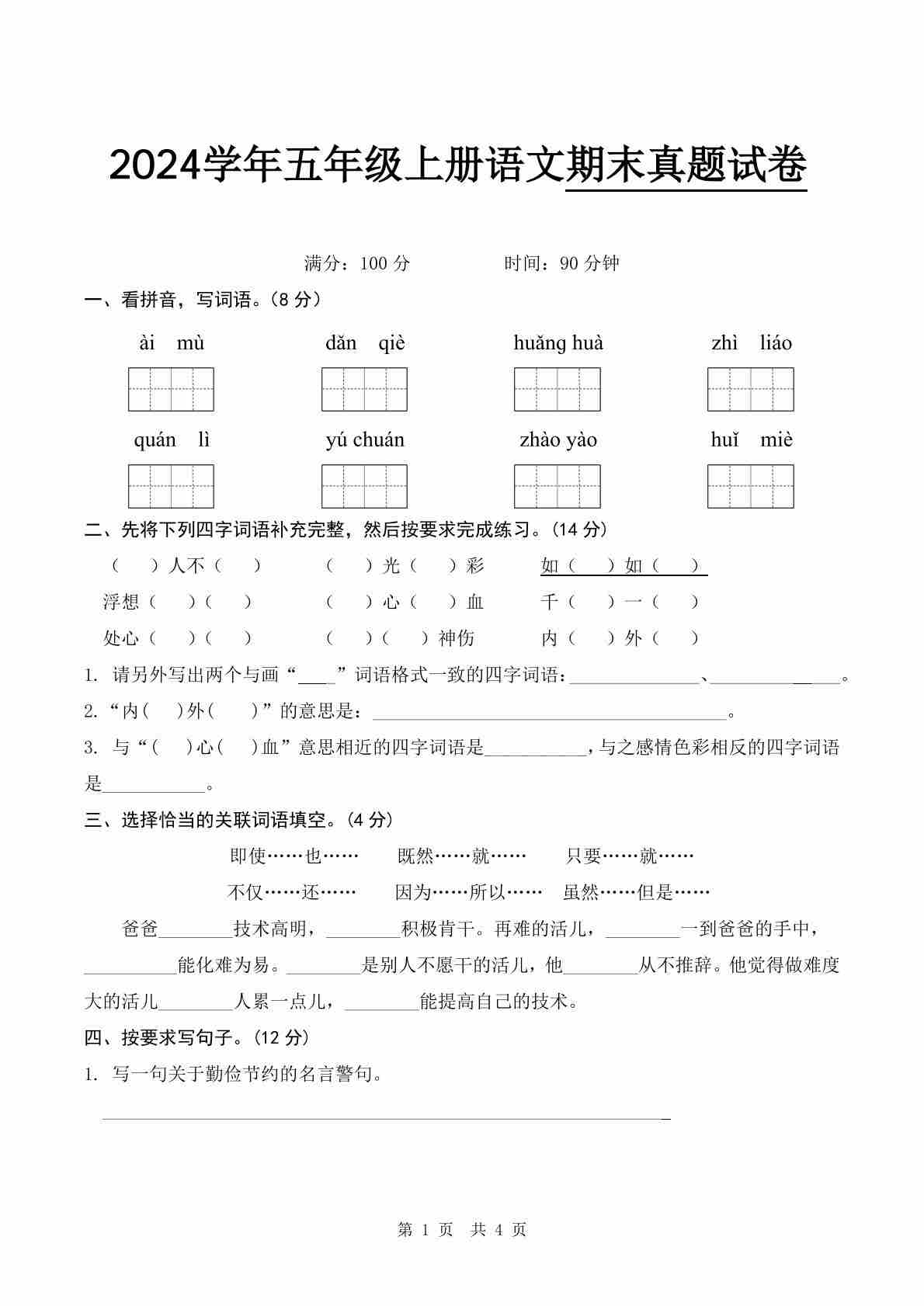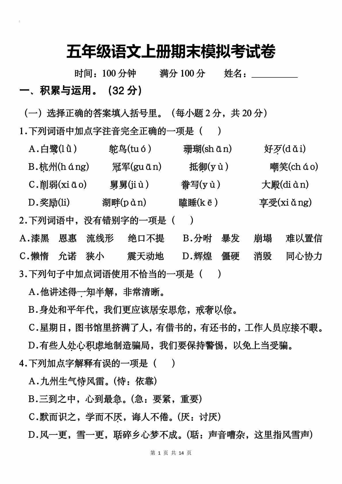 五(上)语文专项必考经典训练100题,学霸掌握这些就够了
